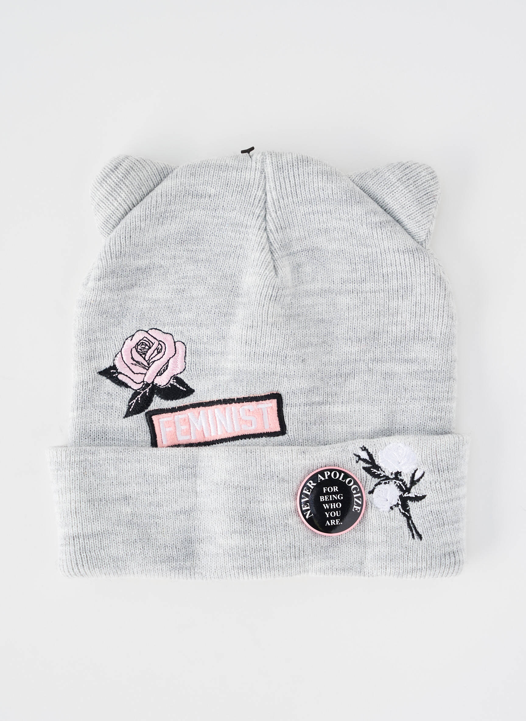 Profitez d’un bon plan mode avec ce bonnet TALLY WEIJL pour femme, une pièce tendance et originale à prix mini pour rehausser vos looks d’hiver. Son coloris gris chiné facile à porter s’accompagne de petits détails qui font la différence, avec des oreilles discrètes sur le dessus pour une touche ludique, ainsi que des patchs brodés façon badges, mêlant une rose, un message affirmé et une touche graphique, pour une allure unique sans vous ruiner.