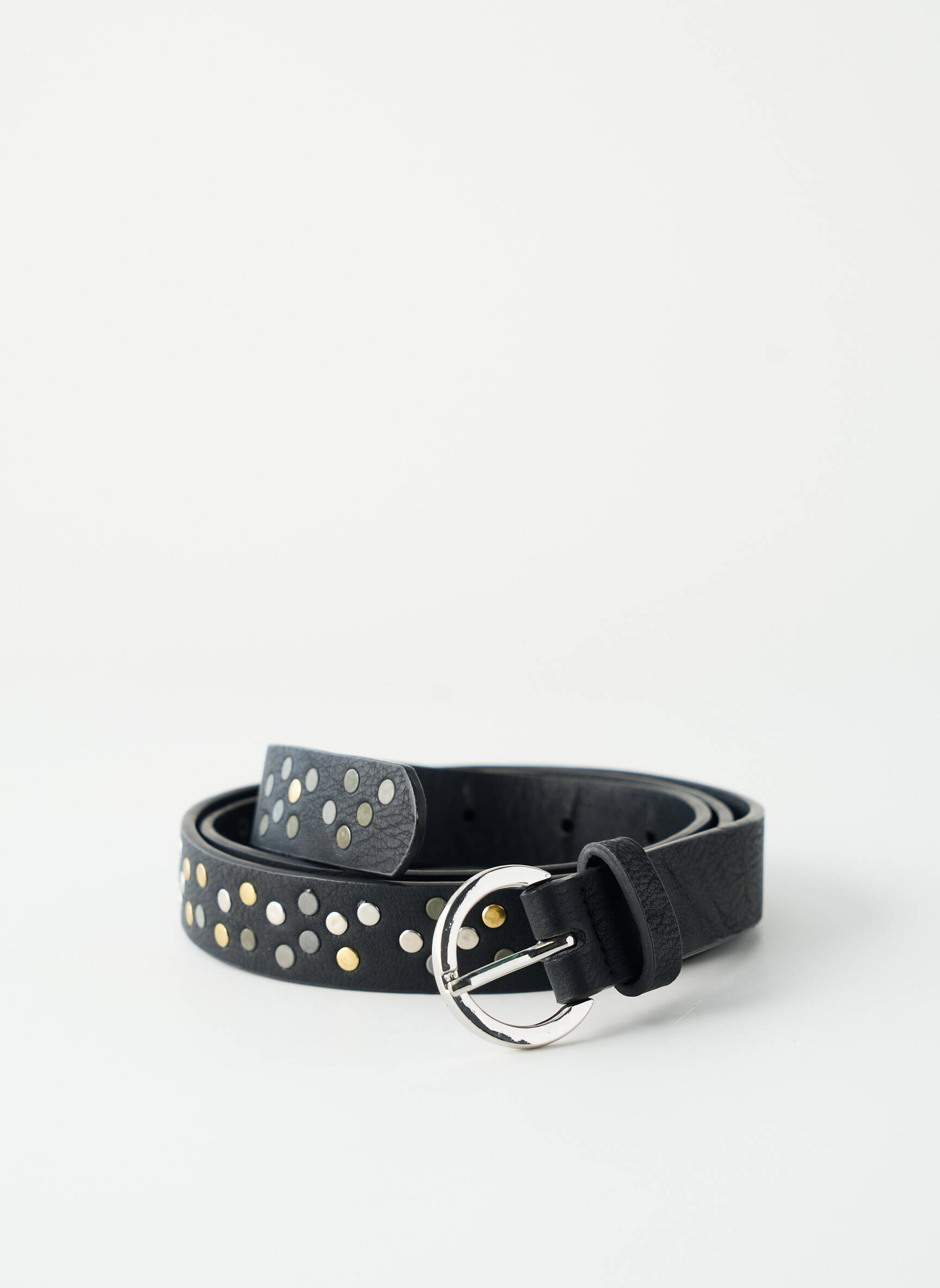 Craquez pour cette ceinture PIECES pour femme, une véritable aubaine pour ajouter une touche tendance à votre look sans vous ruiner. Son design noir rehaussé de petits clous métalliques argentés et dorés lui apporte une allure actuelle et facile à assortir, tandis que la boucle ronde en métal argenté finit le tout avec élégance. C’est l’accessoire idéal pour sublimer une robe ou structurer un jean, tout en profitant d’un super prix déstockage.