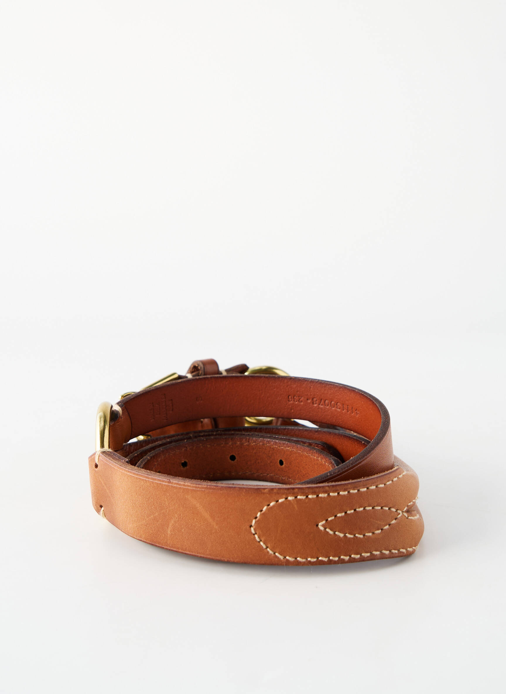 Craquez pour cette ceinture femme signée RALPH LAUREN à prix mini, une occasion rare de profiter de l’élégance d’une grande marque sans se ruiner. Son cuir marron souple se marie parfaitement avec de magnifiques boucles et anneaux dorés, pour rehausser toutes vos tenues avec une touche chic indémodable tout en réalisant une vraie économie.