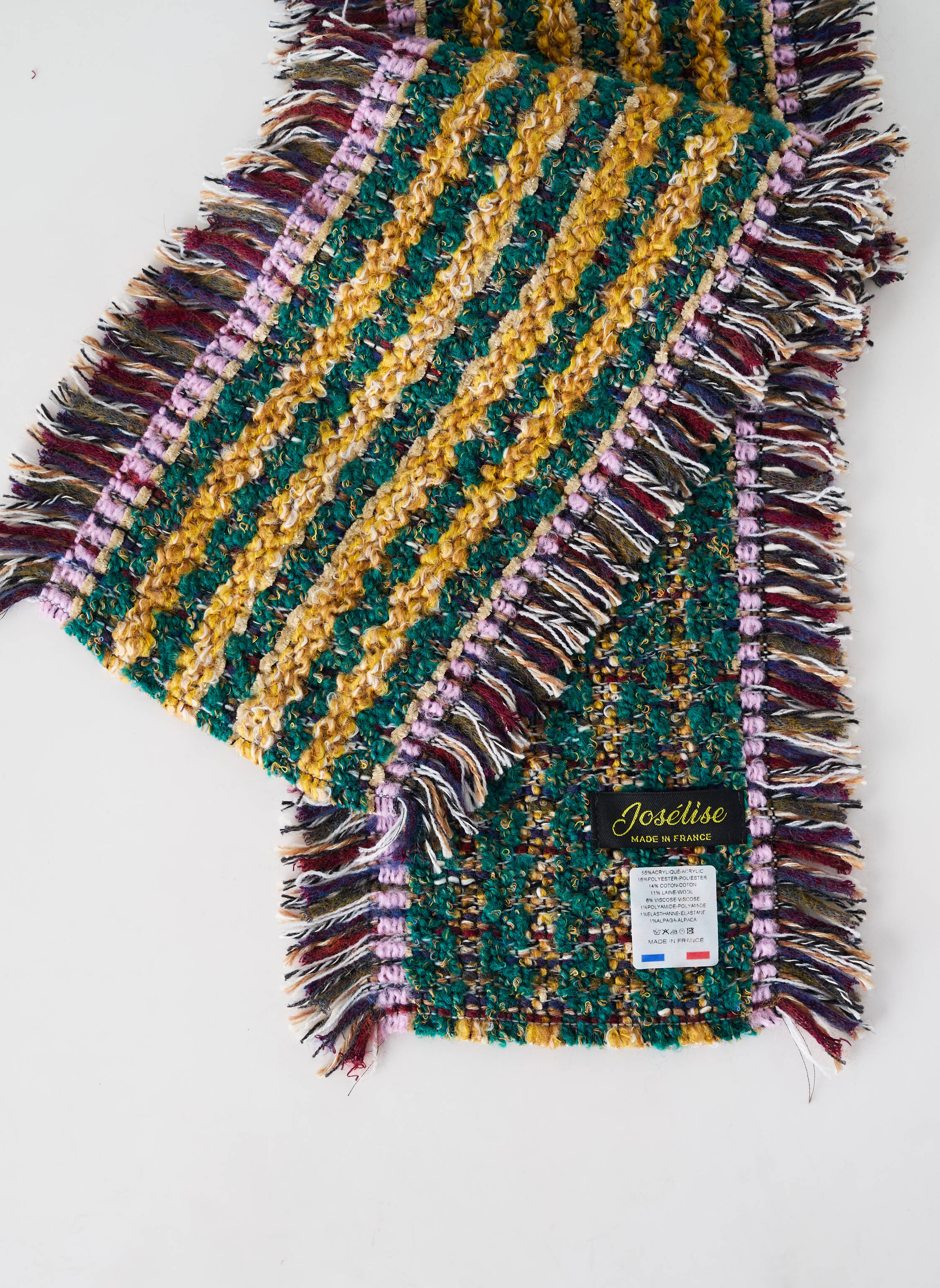 - Composition : 55 % Acrylique, 18 % Polyester, 14 % Coton, 11 % Laine, 8 % Viscose, 1 % Polyamide, 1 % Elasthane, 1 % Alpaga