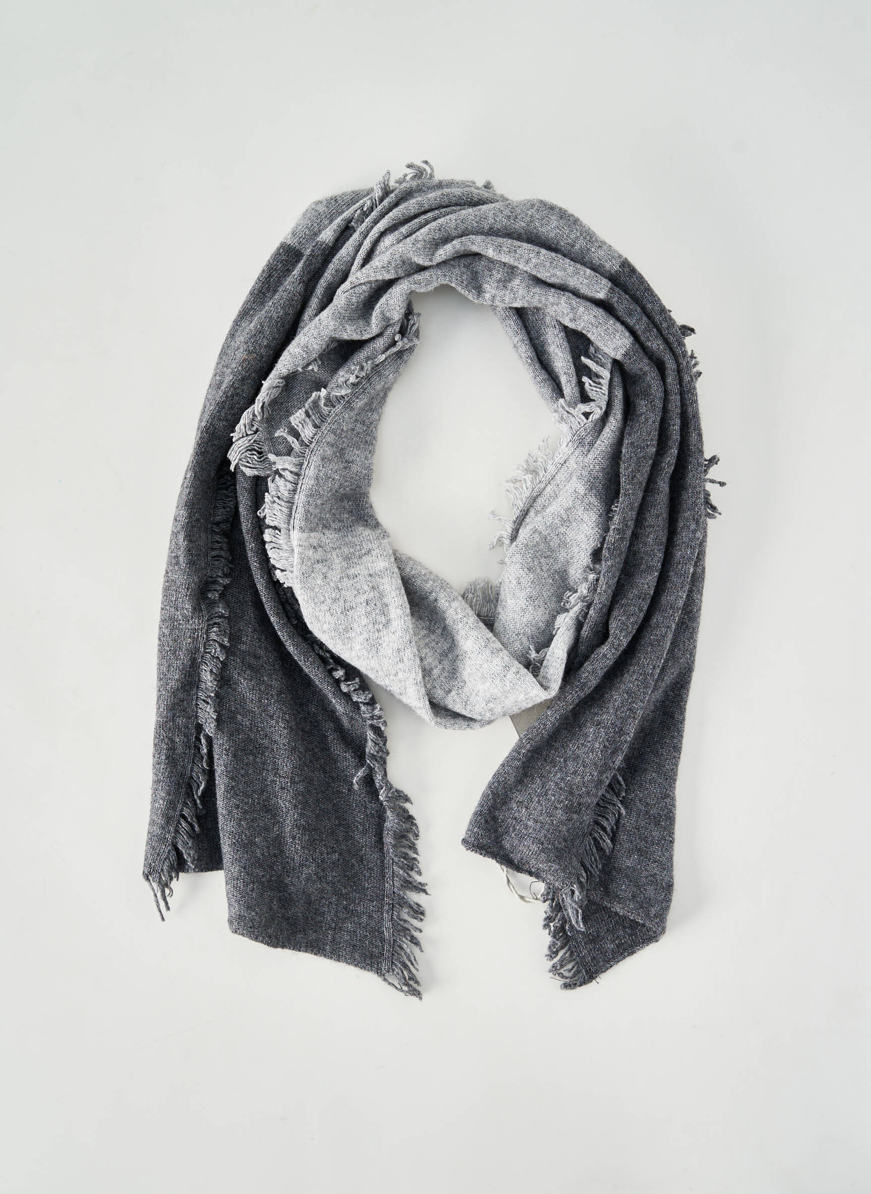 Cette écharpe se porte idéalement drapée autour du cou, en jouant sur un volume généreux pour réchauffer subtilement sans alourdir, et peut compléter avec élégance un manteau long aux lignes épurées ou une veste en cuir pour un contraste sophistiqué. Associez-la à des teintes sobres comme le noir, le blanc cassé ou le bleu marine afin de souligner son dégradé de gris, et ajoutez des accessoires minimalistes pour une allure résolument contemporaine et raffinée.