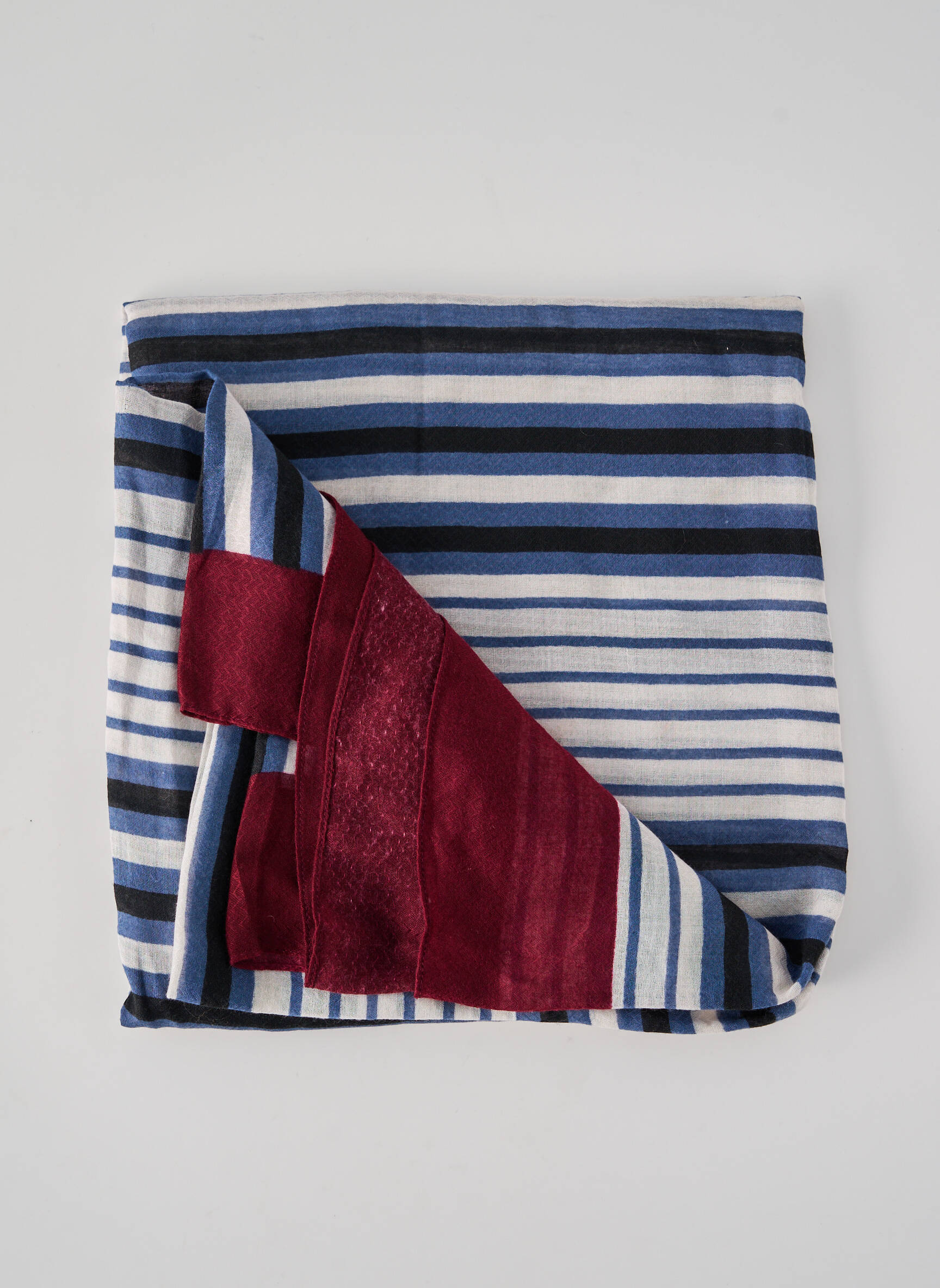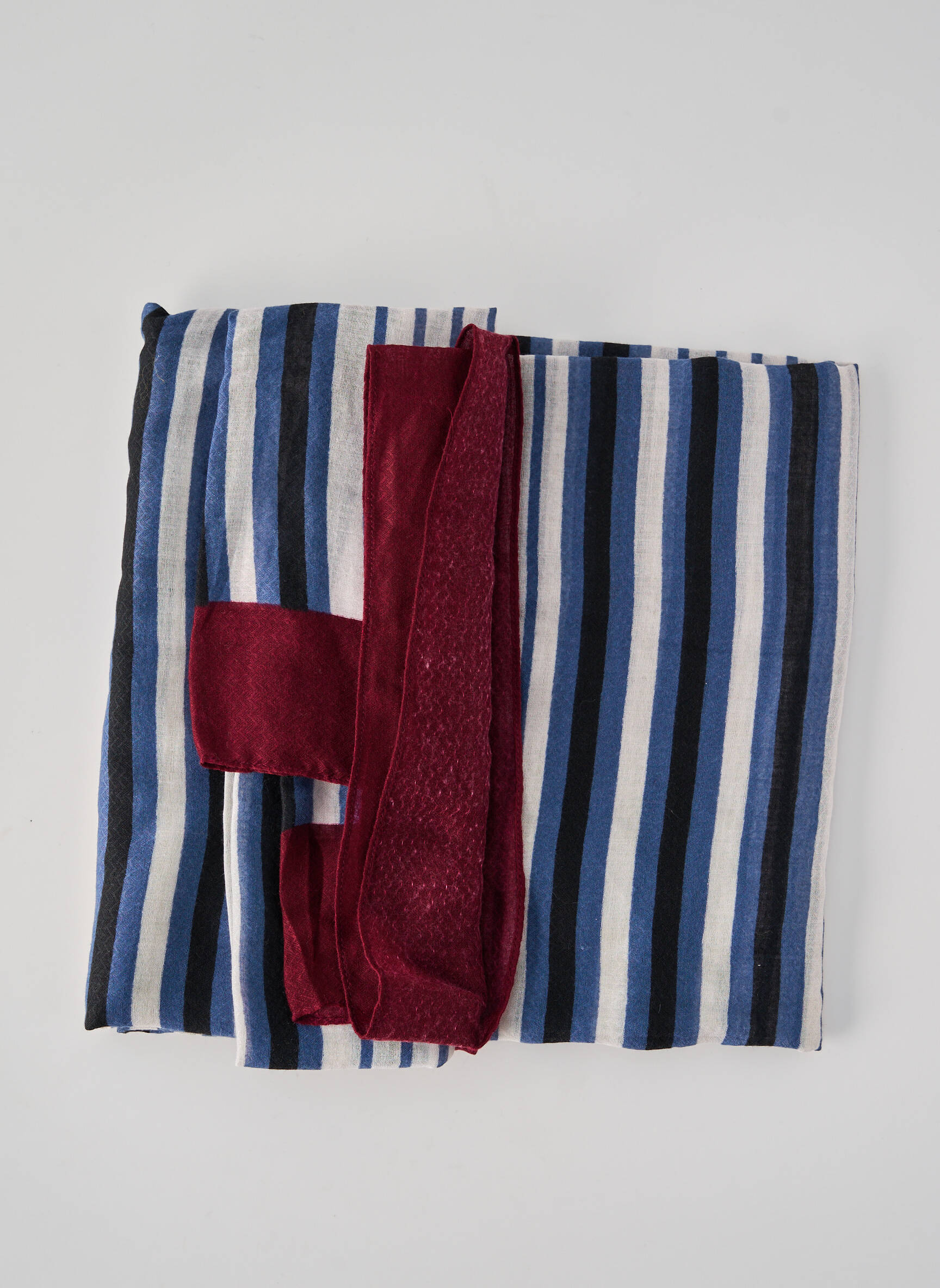 Pour un rendu moderne et effortless, cette écharpe peut se porter enroulée autour du cou sur un manteau uni ou déposée sur les épaules par-dessus un pull ou une veste denim. Elle se marie parfaitement à un jean brut, des boots et un sac bordeaux ou bleu pour rappeler discrètement les teintes du motif, permettant ainsi de jouer sur l’harmonie sans effort entre vos différents accessoires.