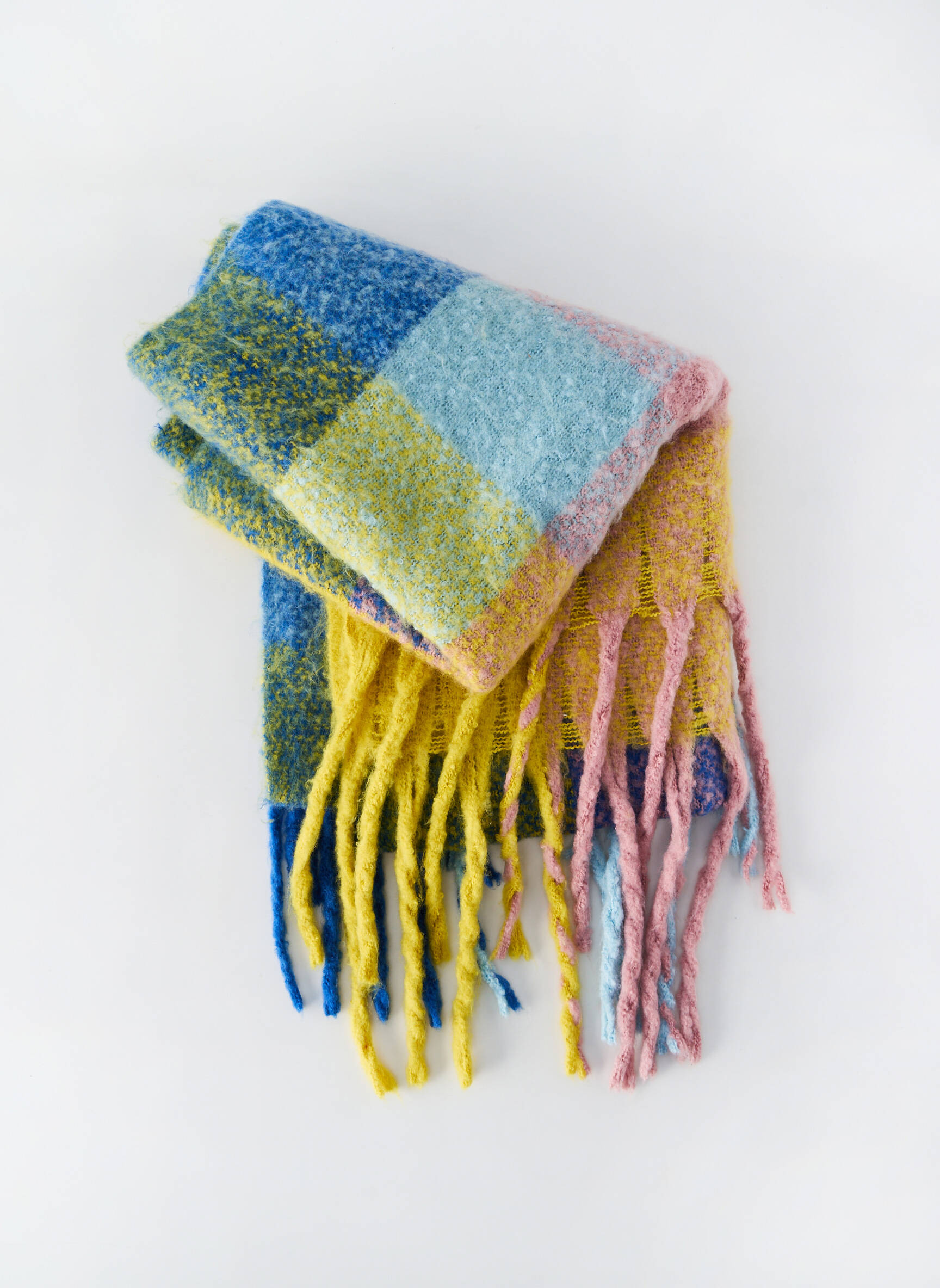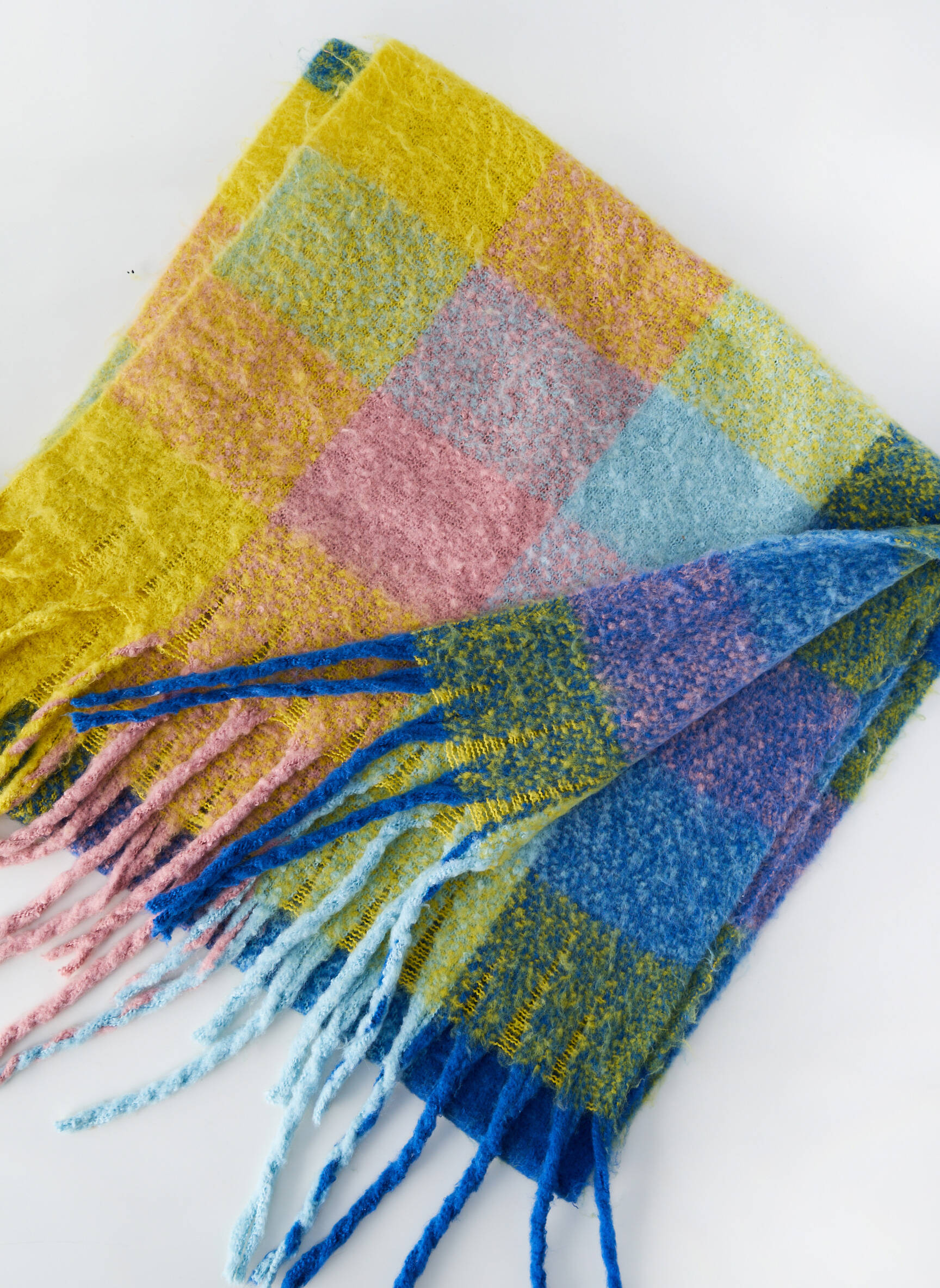 Profitez d'une belle affaire avec cette écharpe colorée pour femme de la marque SANS MARQUE, parfaite pour apporter une touche de chaleur et de douceur à tous vos looks sans vous ruiner. Son motif à larges carreaux pastel mêle joliment le bleu, le jaune et le rose, tandis que ses longues franges torsadées donnent une note tendance et décontractée, idéale pour illuminer votre quotidien à petit prix.