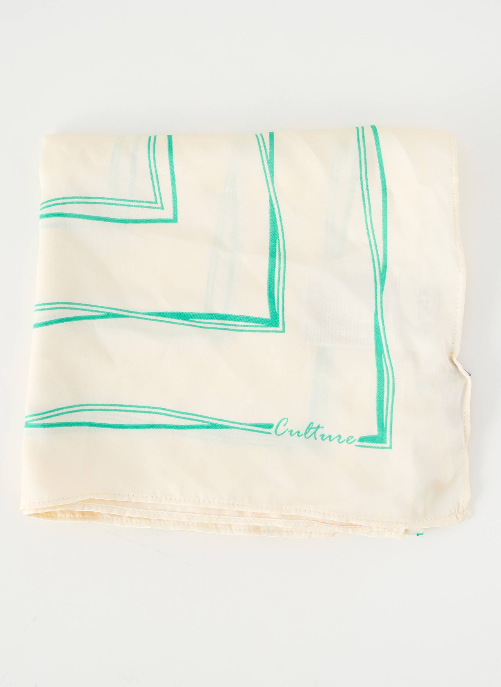 Profitez d'une belle occasion pour compléter votre garde-robe avec ce foulard CULTURE pour femme, un accessoire au charme discret qui rehaussera toutes vos tenues sans faire exploser votre budget. Son tissu léger à la teinte crème, rehaussé de motifs graphiques vert émeraude, donne une touche d'élégance moderne et raffinée, idéale pour apporter une note chic à un look du quotidien ou finir une tenue plus habillée. Ce foulard bon plan, avec sa finition soigneuse et son style intemporel, s’impose comme une vraie affaire pour rester tendance à prix malin.