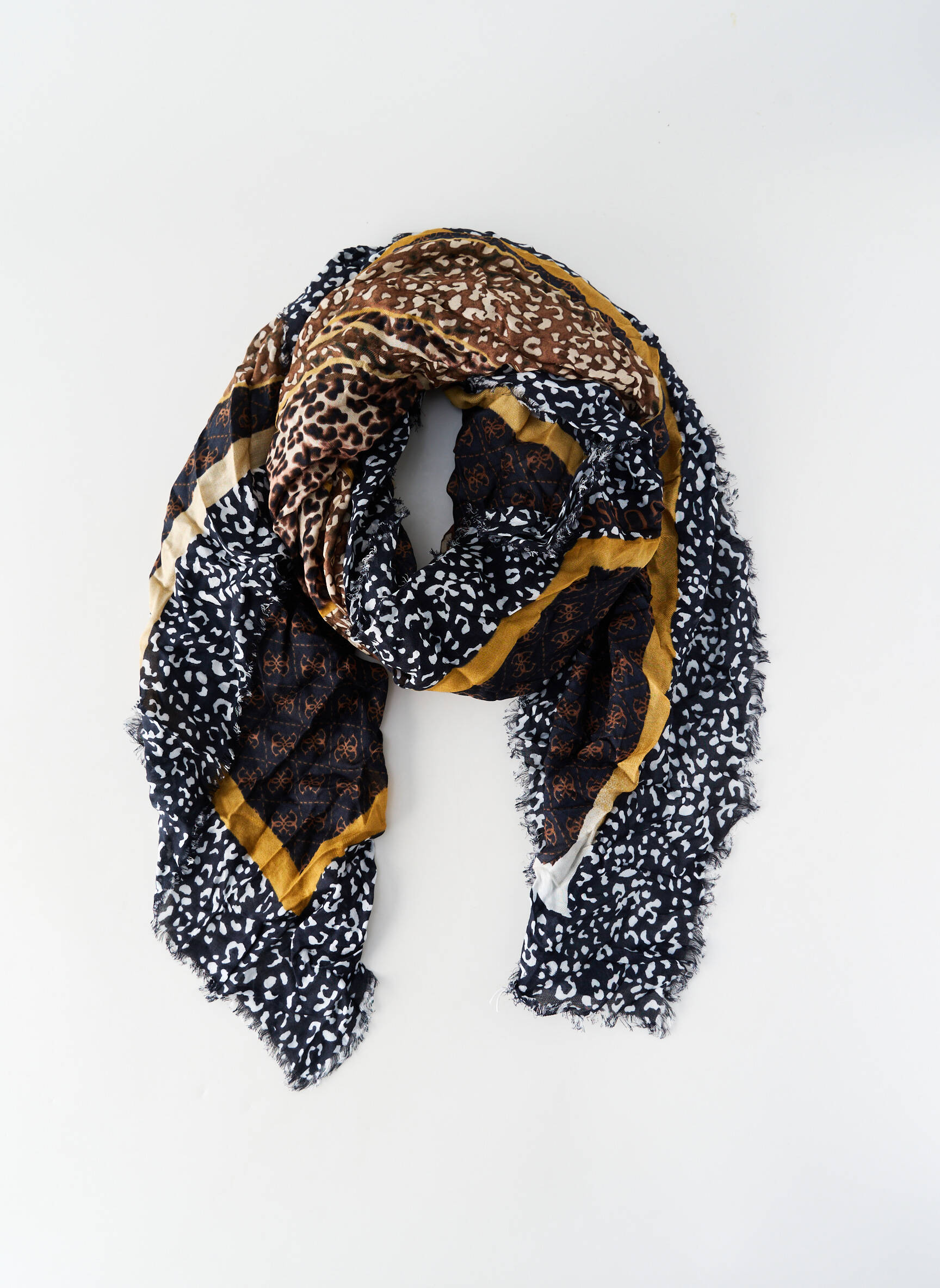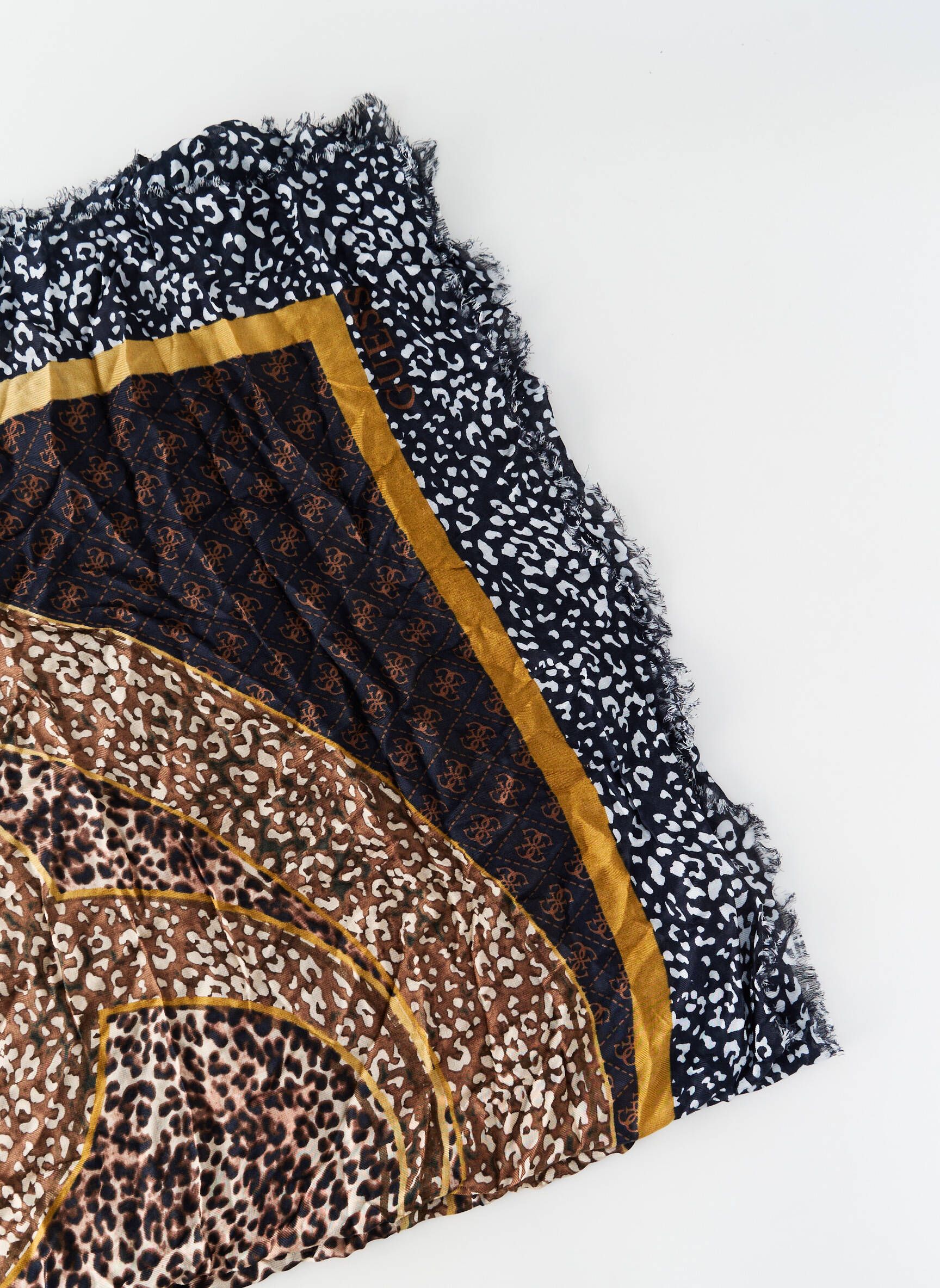 Profitez d’une belle opportunité mode avec ce foulard pour femme signé Guess, à petit prix. Son motif animalier mêle élégamment des touches de noir, blanc, marron et doré pour apporter une touche de caractère à vos tenues, tandis que les bords effilochés lui donnent un côté tendance et décontracté. C’est le bon plan parfait pour accessoiriser votre look sans vous ruiner et ajouter une note stylée tout en douceur.