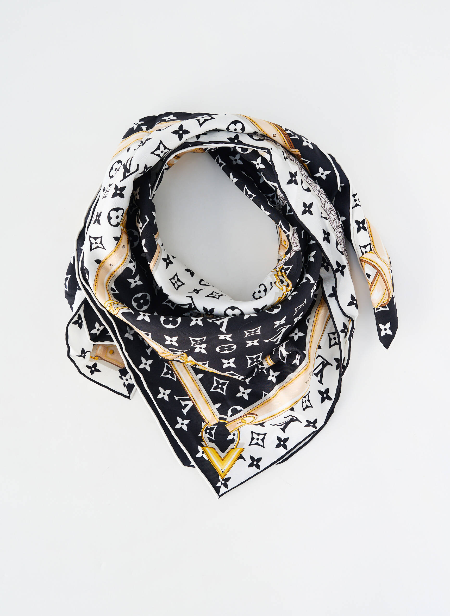 Offrez-vous une touche d'élégance emblématique à prix irrésistible avec ce foulard pour femme signé Louis Vuitton, un accessoire iconique qui conjugue raffinement intemporel et bon plan mode. Sa texture fluide et son motif signature aux nuances noires, blanches et dorées subliment instantanément n’importe quelle tenue, tout en affichant fièrement le monogramme de la maison. Véritable pièce de luxe accessible, ce foulard est l’option parfaite pour rehausser votre style sans vous ruiner.
