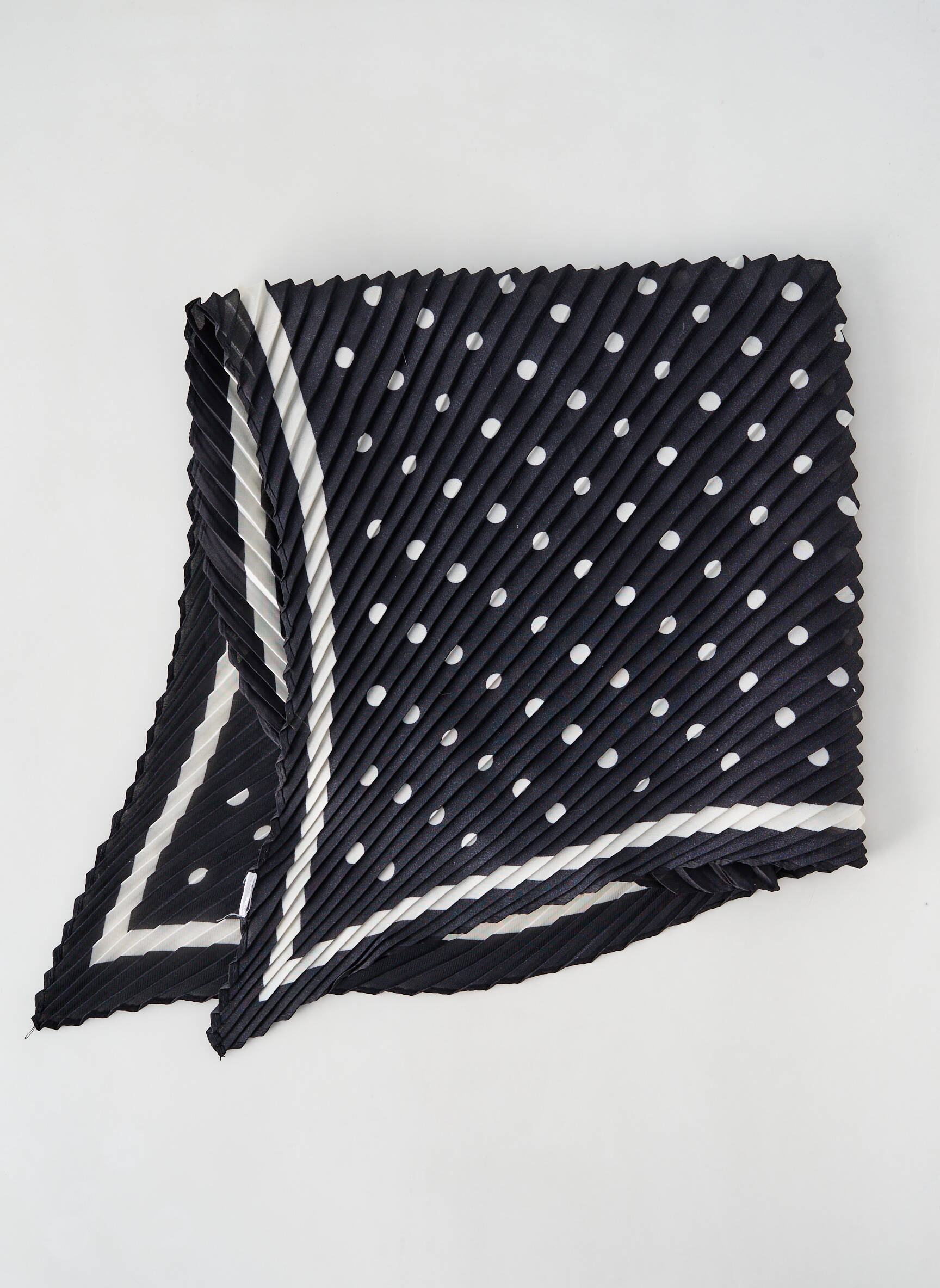 Craquez pour ce foulard femme à petit prix qui apporte une touche élégante et moderne à toutes vos tenues grâce à son motif graphique noir parsemé de pois blancs, relevé par ses fines lignes blanches en diagonale, un accessoire indispensable et malin pour rehausser votre look sans vous ruiner.