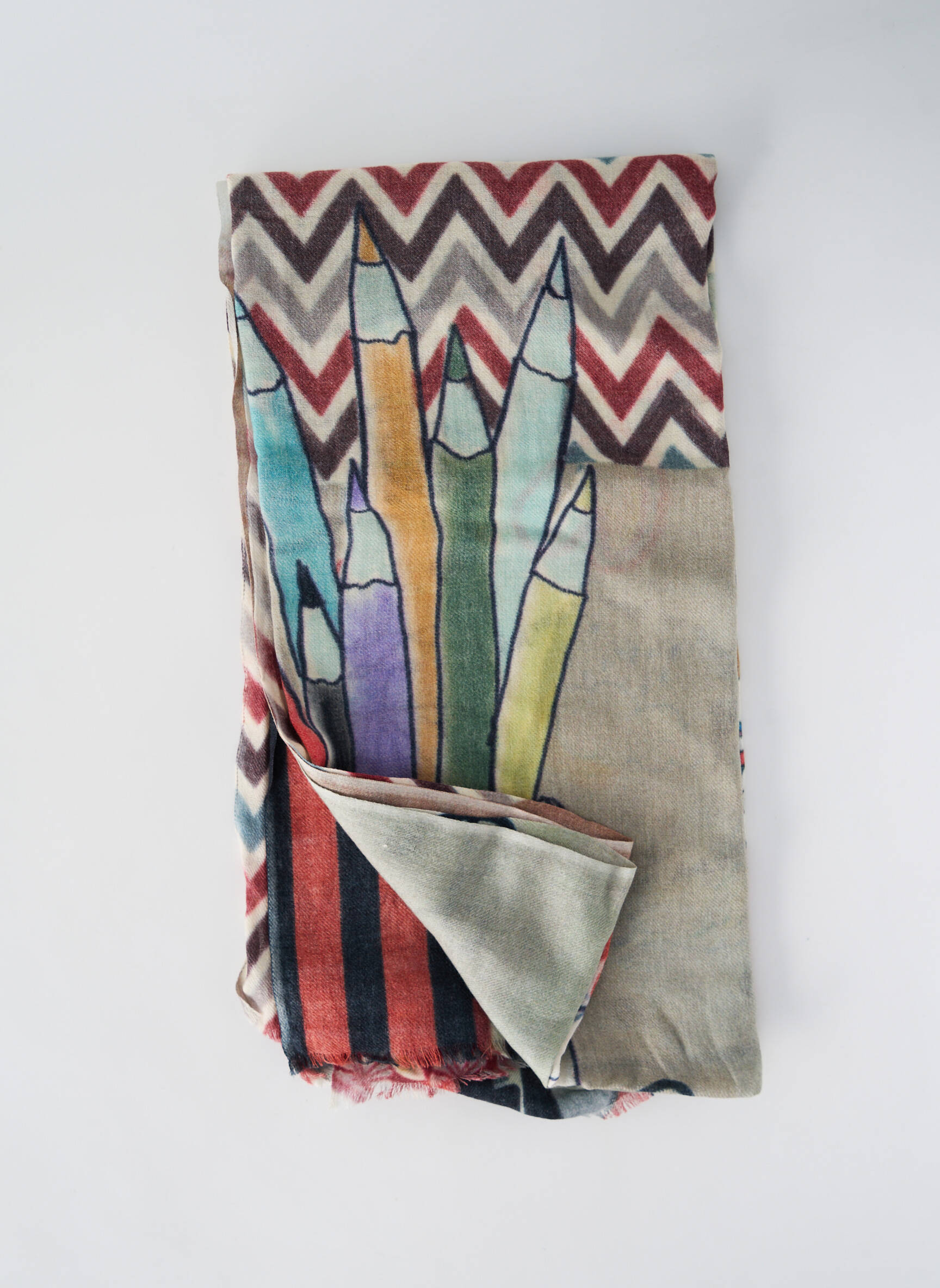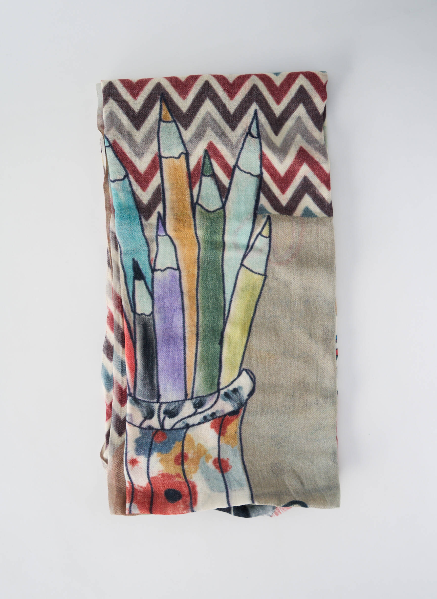 Craquez pour ce foulard pour femme signé STORIATIPIC, une pièce originale à prix mini qui ajoutera une touche de fantaisie à toutes vos tenues avec ses motifs graphiques colorés rappelant des crayons dessinés à la main et un élégant fond en zigzag, parfait pour se démarquer sans se ruiner.