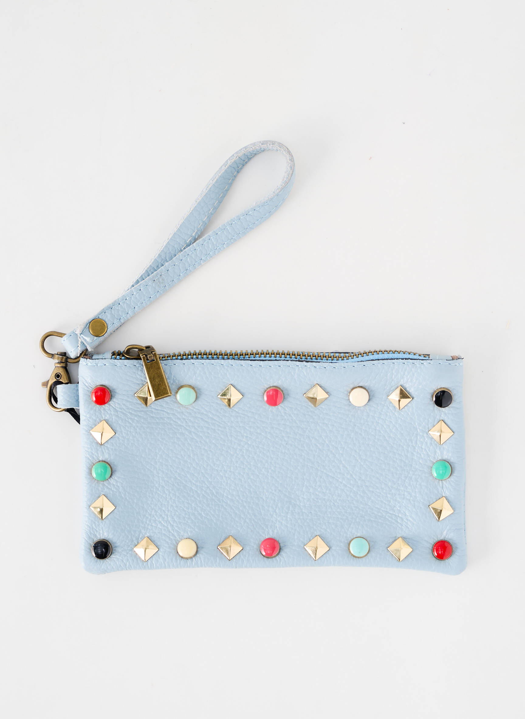 Craquez pour cette pochette VIMODA à prix mini, idéale pour apporter une touche tendance à toutes vos tenues sans vous ruiner. Son design en cuir bleu pastel, orné de clous dorés et de rivets colorés, combine élégance et originalité pour accompagner aussi bien vos soirées que vos sorties quotidiennes, tout en profitant d’une belle économie sur ce modèle multi-marques.