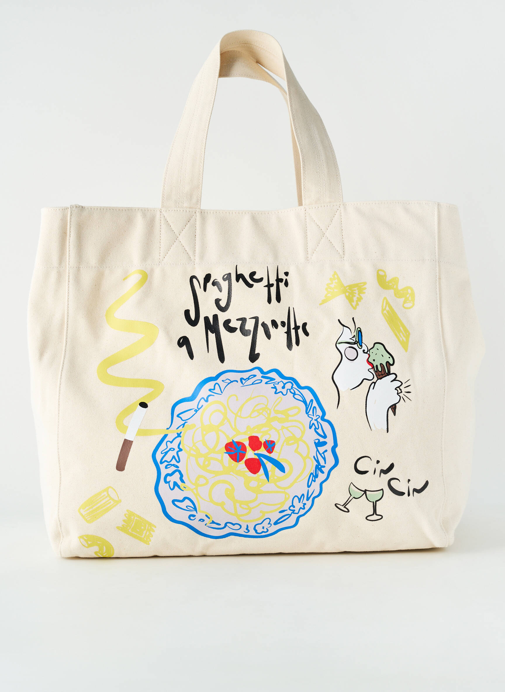 Profitez d’un véritable bon plan avec ce sac pour femme signé CLOSED, qui conjugue style décalé et petit prix pour un look tendance sans se ruiner ; sa grande toile écrue est animée de motifs colorés et ludiques inspirés par l’Italie, avec un dessin de spaghetti, des touches graphiques amusantes et des inscriptions originales, parfait pour apporter une touche de fantaisie à toutes vos sorties.