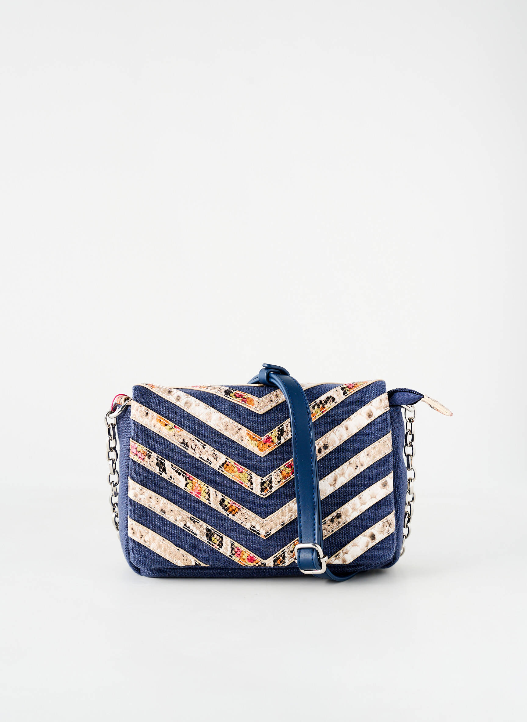 Profitez d’un véritable bon plan avec ce sac FUCHSIA pour femme, un accessoire tendance à prix tout doux. Son design élégant mêle harmonieusement les motifs chevrons bleu et crème avec des touches colorées, apportant une note originale et sophistiquée à vos tenues. La bandoulière chaîne et la lanière réglable assurent un porté confortable, idéal au quotidien comme en soirée, sans vous ruiner.