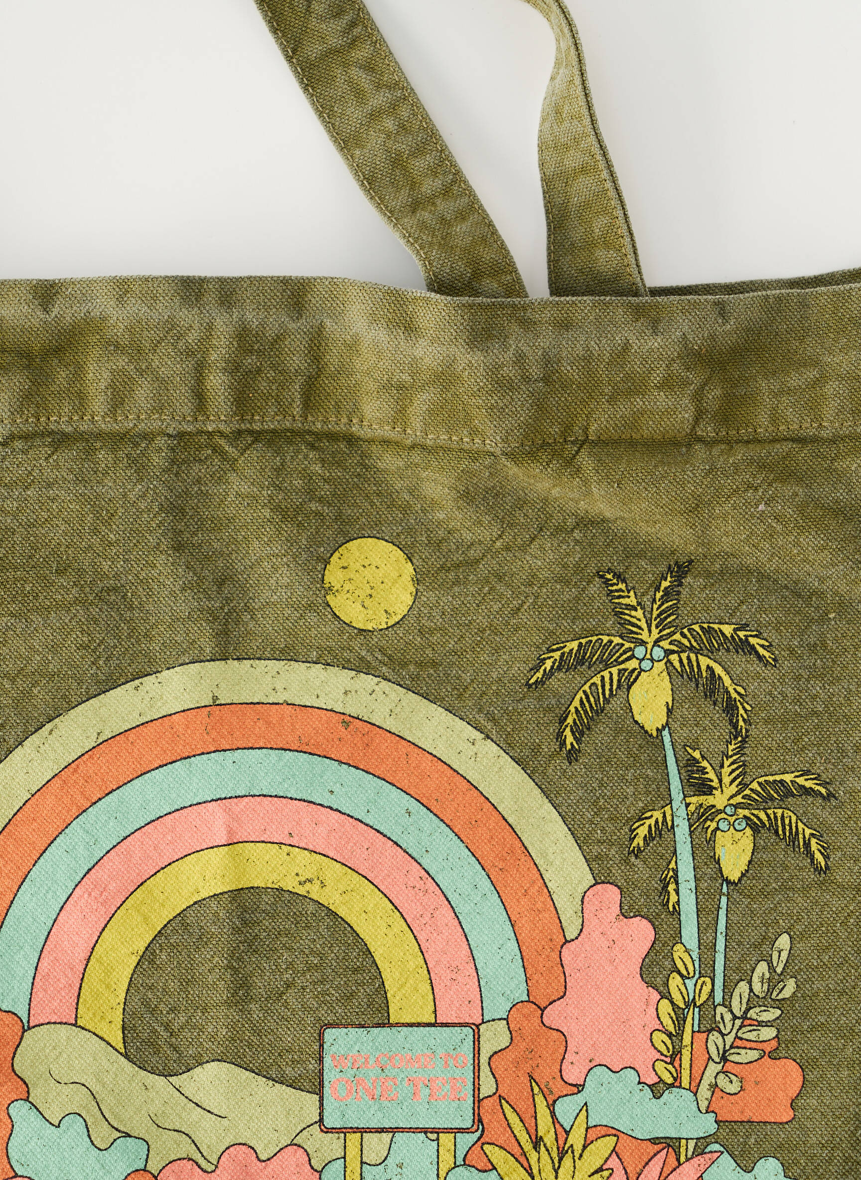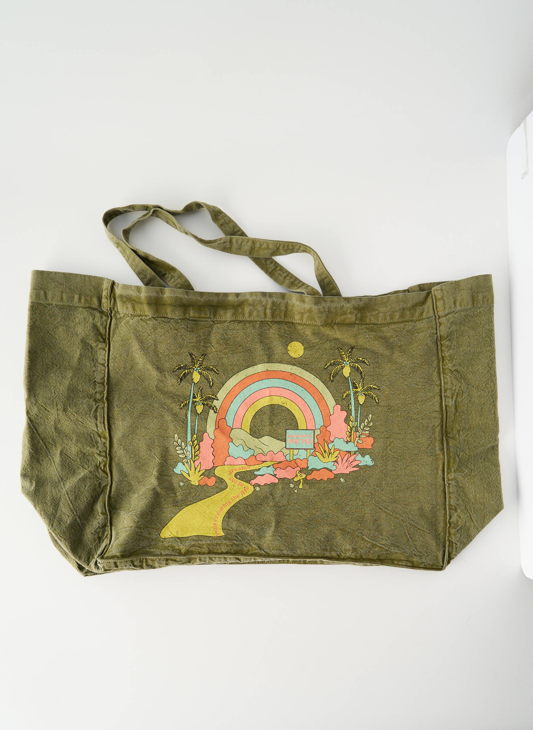 Profitez d'une véritable affaire avec ce sac pour femme de la marque ONE TEE, au look vintage et original, parfait pour ajouter une touche de style à petit prix à votre quotidien. Son coloris kaki et son imprimé aux tons pastel, évoquant une ambiance rétro avec arc-en-ciel, palmiers et soleil, en font un accessoire pratique et tendance à saisir sans hésiter pour toutes vos sorties.