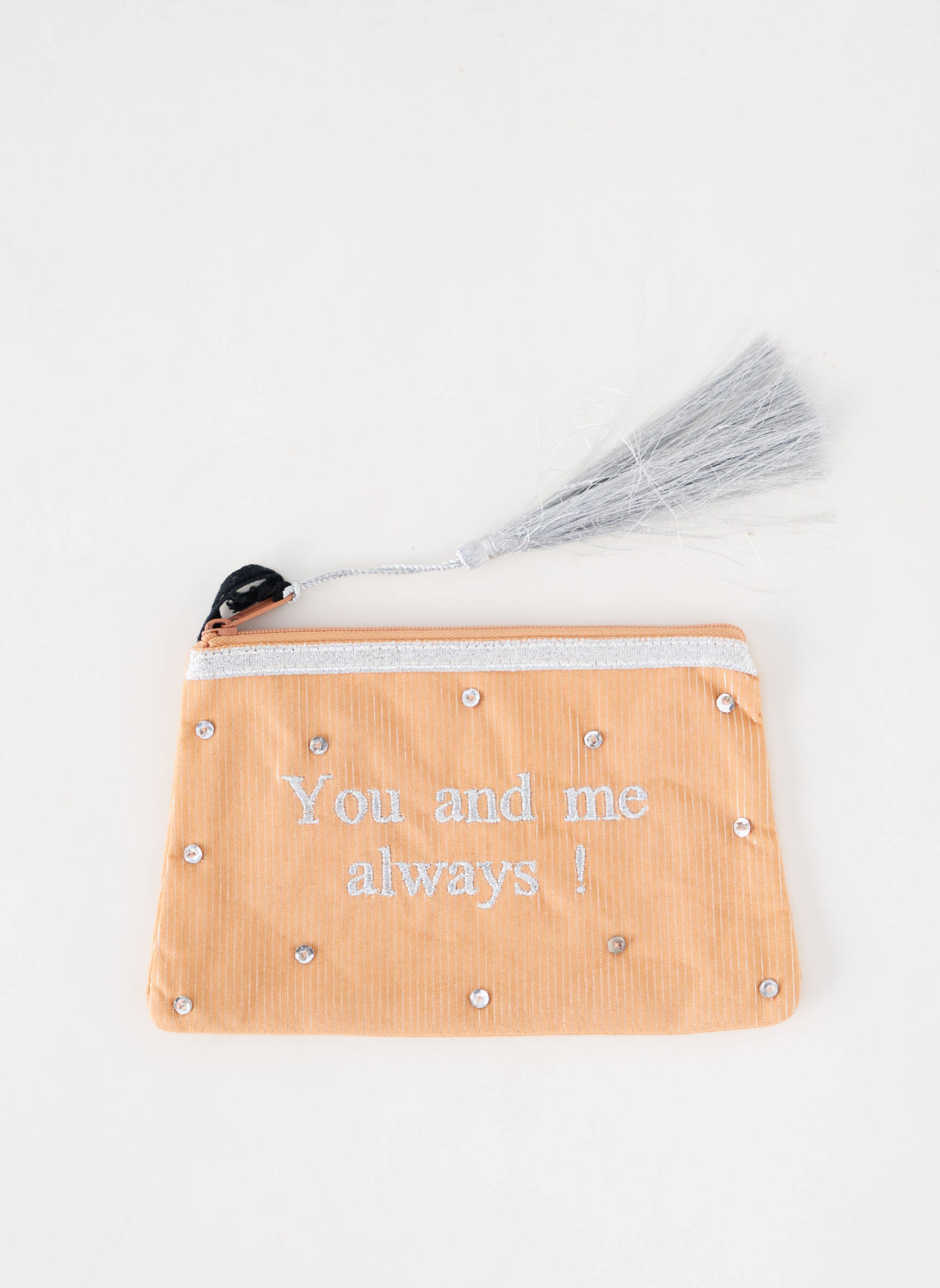 Voici l’occasion idéale de craquer pour une trousse PETITE MENDIGOTE sans se ruiner : ce modèle pour femme séduit avec son coloris doux, sa texture côtelée, et son inscription « You and me always ! » brodée à l’avant, le tout rehaussé de petits strass et d’un pompon argenté qui apporte la touche finale à ce bel accessoire à prix mini.