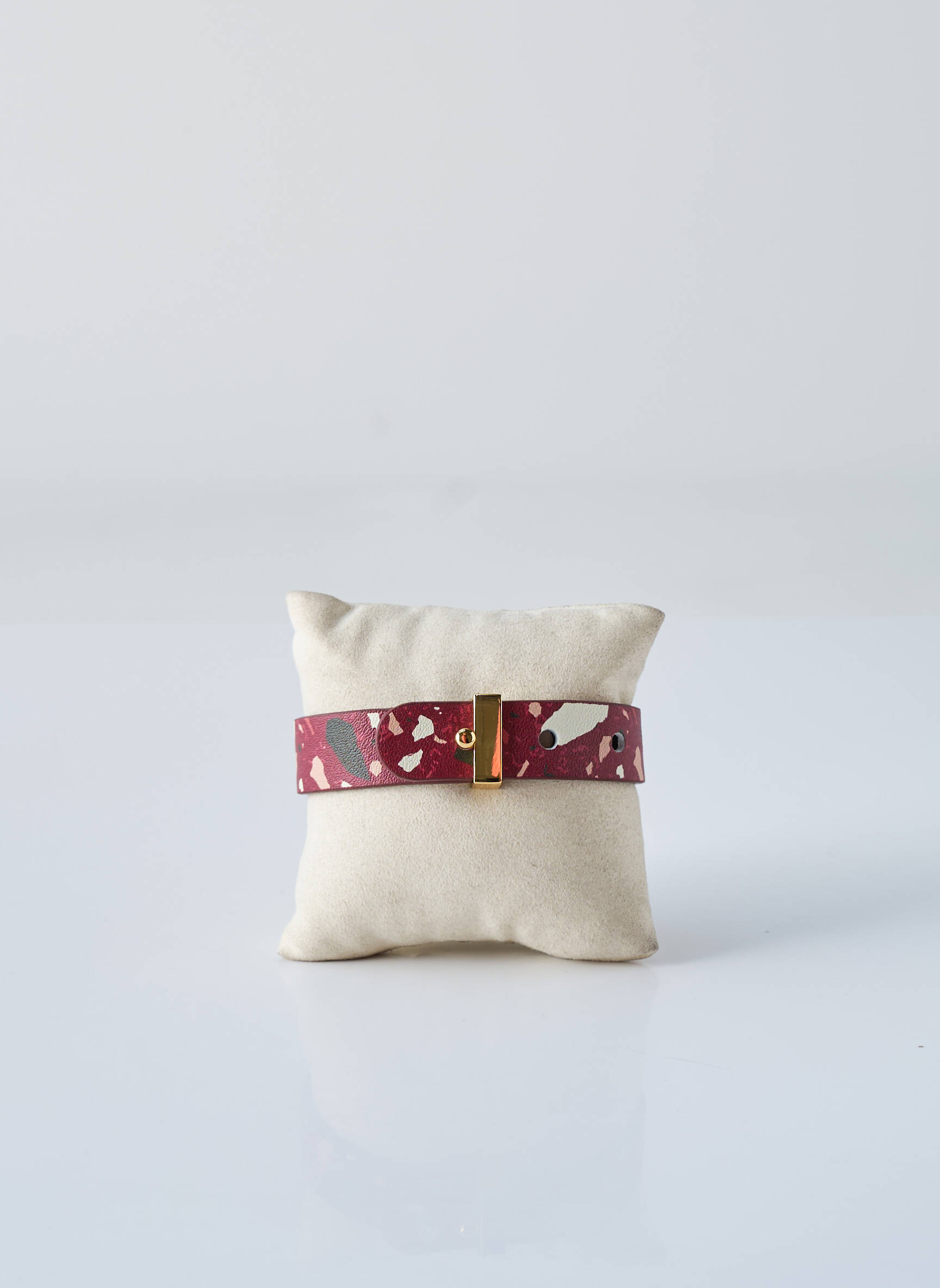 Imaginez un souffle d’art contemporain au poignet, où la collaboration entre BANGLE UP et LOUVREUSE révèle un bracelet unique en cuir aux teintes grenat parsemées de touches écrues éclatantes, sublimé par une fermeture dorée délicate qui apporte une touche d’élégance moderne et raffinée.