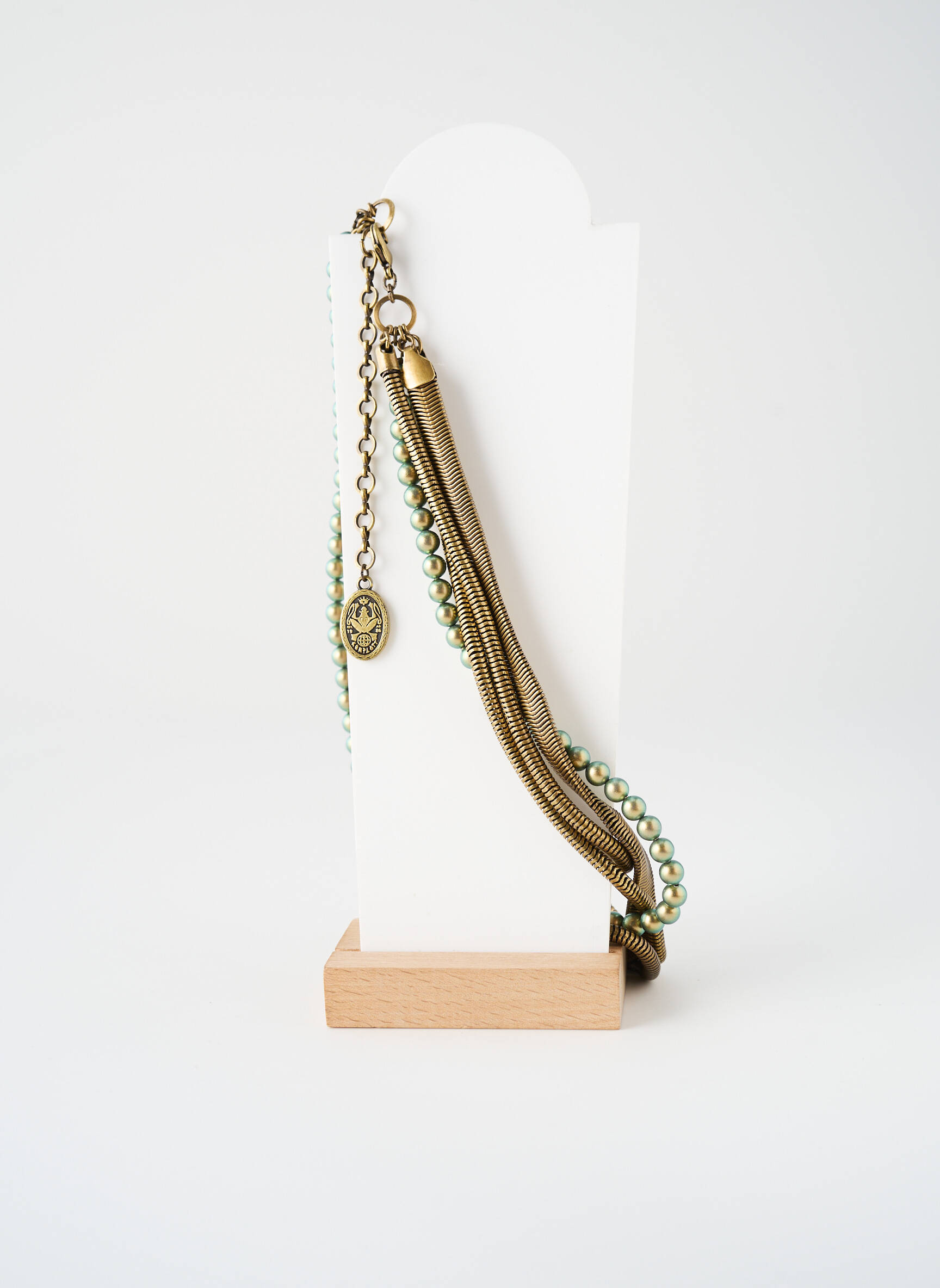 Ce collier s’accorde parfaitement avec une blouse fluide à col rond ou un top en maille fine pour mettre en valeur sa longueur et ses détails. Il complète joliment une tenue décontractée composée d’un jean brut ou d’une jupe midi, mais apporte aussi une note sophistiquée à une petite robe noire pour une soirée. Pour un look harmonieux, associez-le à des boucles d’oreilles discrètes ou à un bracelet simple dans les mêmes tons dorés ou verts, afin de préserver l’équilibre et l’élégance de l’ensemble.