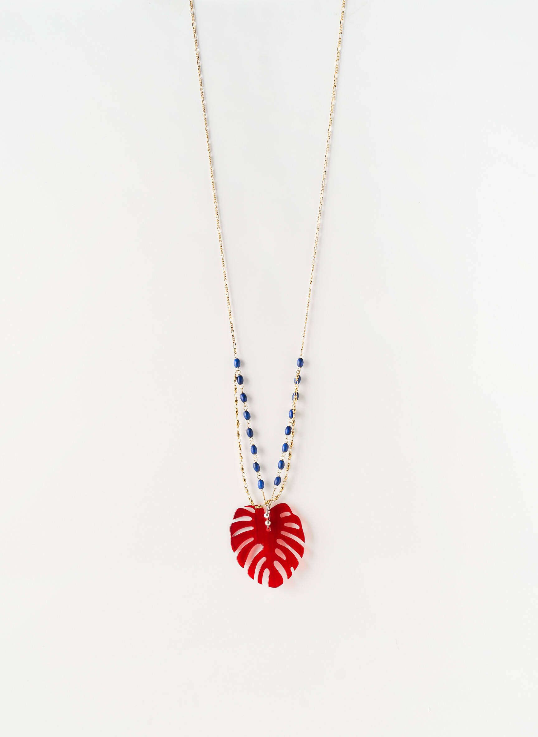 Craquez pour ce collier NATURE BIJOUX à prix tout doux, parfait pour apporter une touche d’originalité à vos tenues sans vous ruiner grâce à son pendentif en forme de feuille exotique rouge qui se distingue avec élégance, délicatement suspendu à une double chaîne dorée rehaussée de petites perles bleues raffinées, un bijou tendance à petit prix qui attire tous les regards.