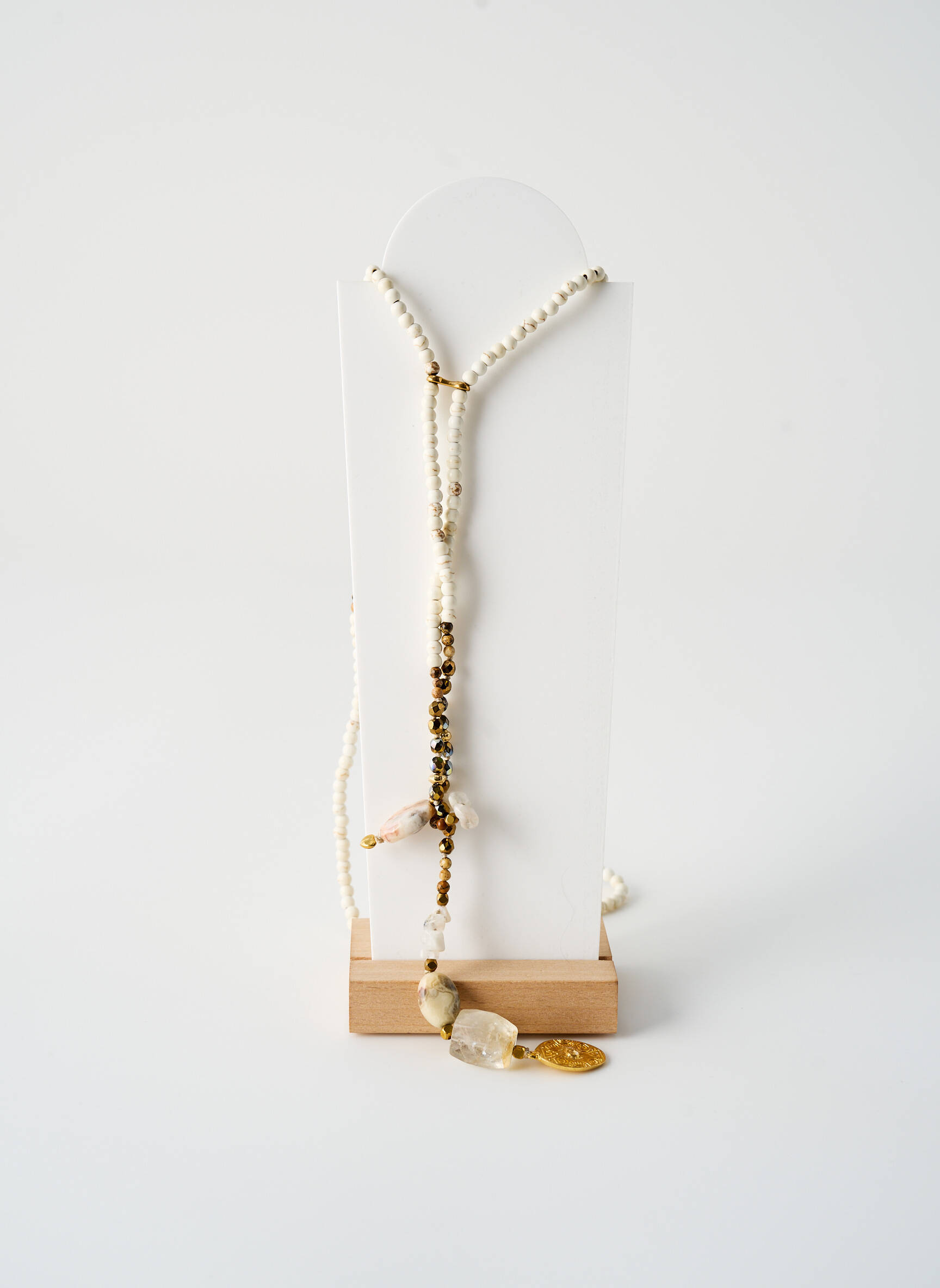 Ce collier se porte aussi bien seul pour un style épuré qu’en accumulation avec d’autres chaînes fines pour créer une superposition tendance et personnalisée. Il s’accorde à merveille avec une blouse fluide, un t-shirt blanc ou une robe d’été, et apporte une touche bohème-chic à un look de tous les jours. Pour un effet harmonieux, il peut également être associé à des bracelets dorés ou des boucles d’oreilles discrètes qui mettent en valeur ses notes naturelles et lumineuses.