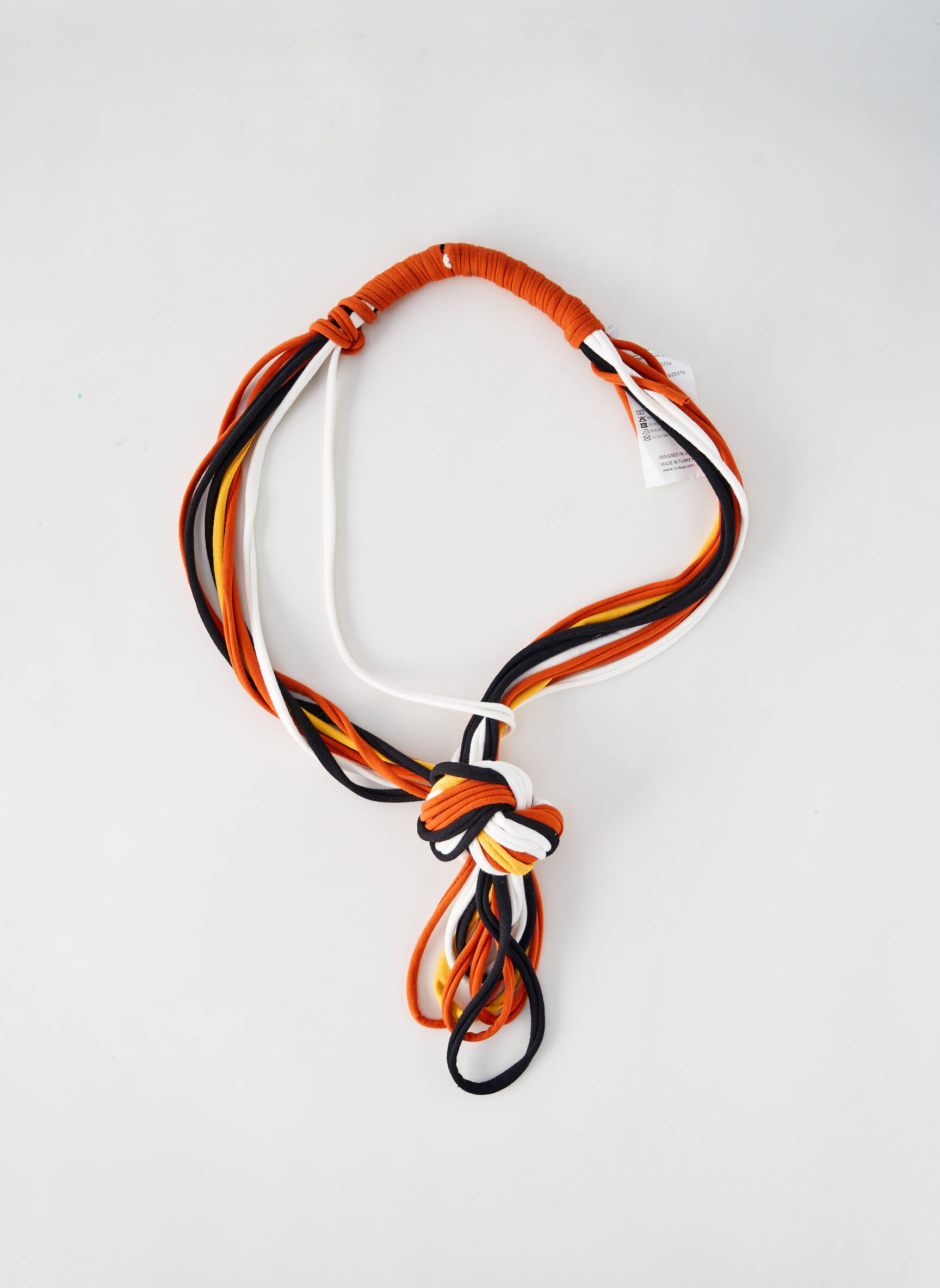Craquez pour ce sautoir LUUKAA pour femme, un accessoire original à prix mini parfait pour sublimer toutes vos tenues sans vous ruiner. Composé de plusieurs cordons multicolores, entremêlés dans des tons orangés, rouges, noirs et blancs, il affiche un style graphique résolument tendance et audacieux. Son joli nœud central ajoute une touche design et moderne qui fait la différence, idéal pour apporter une note unique à votre look tout en profitant d'une vraie bonne affaire.