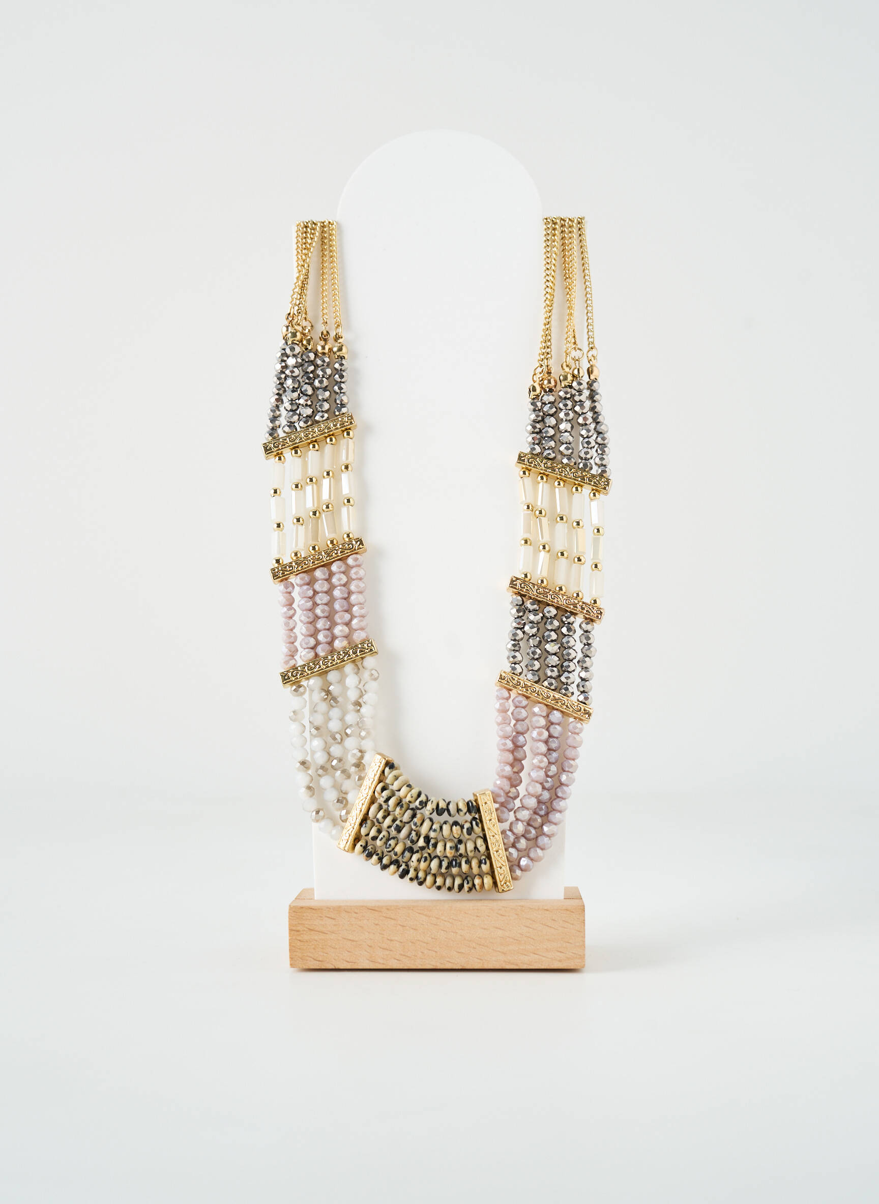 Craquez pour ce superbe sautoir de la marque TATA GISELE, une pièce tendance à petit prix qui fait toute la différence pour sublimer vos tenues. Ce collier se distingue par sa composition originale de rangs de perles aux nuances douces mêlant le rose poudré, l’ivoire et le doré, ponctués de touches métalliques raffinées pour une allure à la fois élégante et moderne. Véritable atout style, il attire le regard tout en restant facile à porter au quotidien, une occasion idéale de vous offrir un accessoire chic sans vous ruiner.