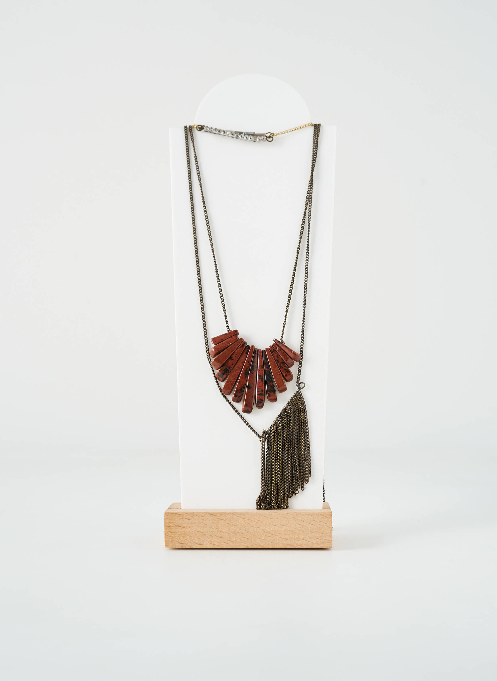 Ce sautoir se porte idéalement sur un haut uni ou un pull en maille pour mettre en valeur son contraste et attirer l’œil. Il s’associe très facilement à une veste en jean ou à une chemise fluide pour une allure casual chic, et se marie à merveille avec des boucles d’oreilles discrètes et un sac en cuir naturel pour composer un look harmonieux sans surcharge.