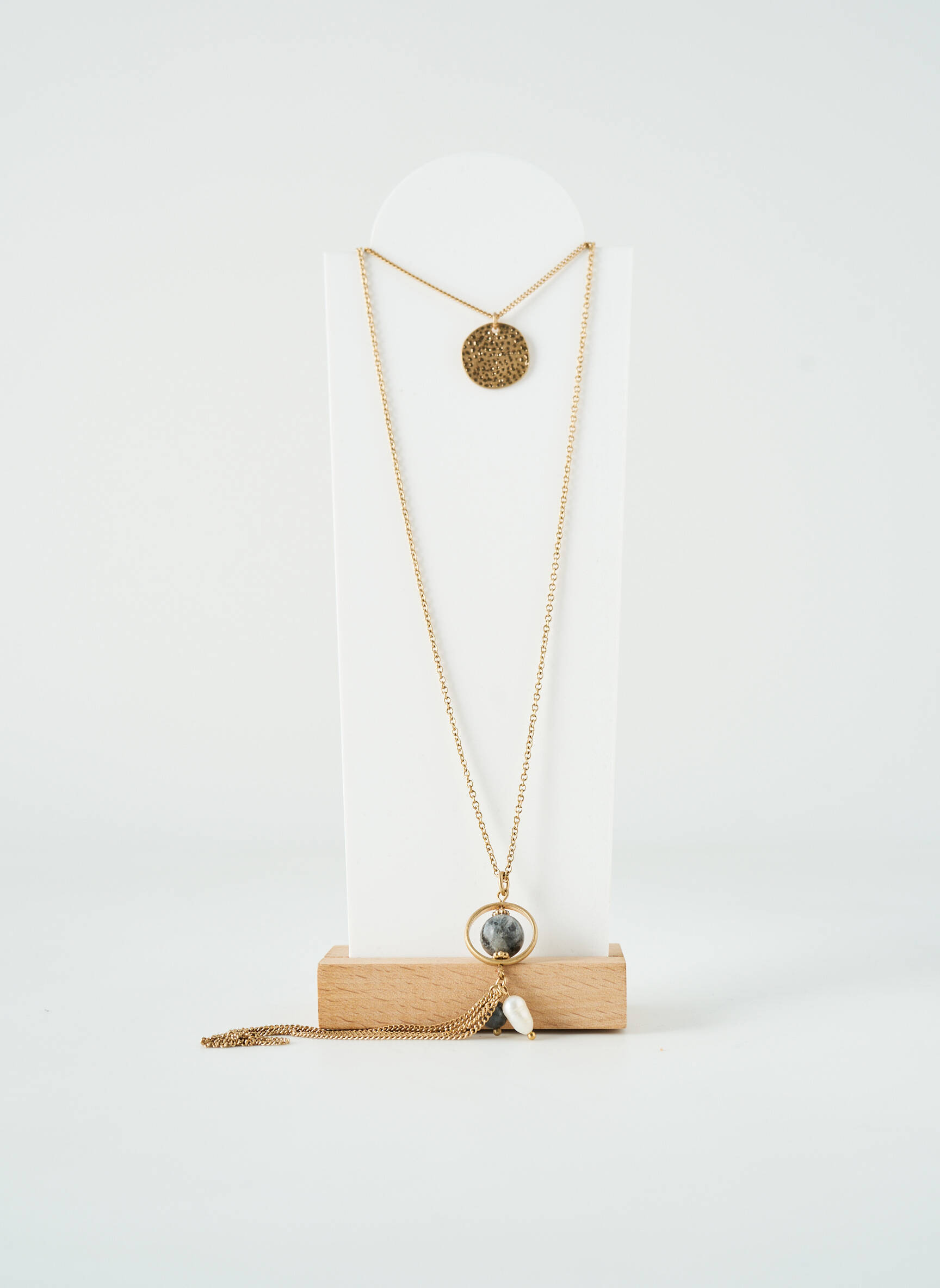 Ce sautoir se glisse parfaitement sur un pull uni ou un chemisier fluide pour rehausser instantanément une silhouette, ajoutant une note de caractère même à une tenue toute simple. Il peut aussi se marier à d’autres bijoux fins dorés, comme des petites créoles ou des bracelets délicats, pour créer une harmonie élégante tout en subtilité. Idéal également avec une robe noire ou un top col V, il allonge visuellement le buste et attire la lumière, sans jamais en faire trop.