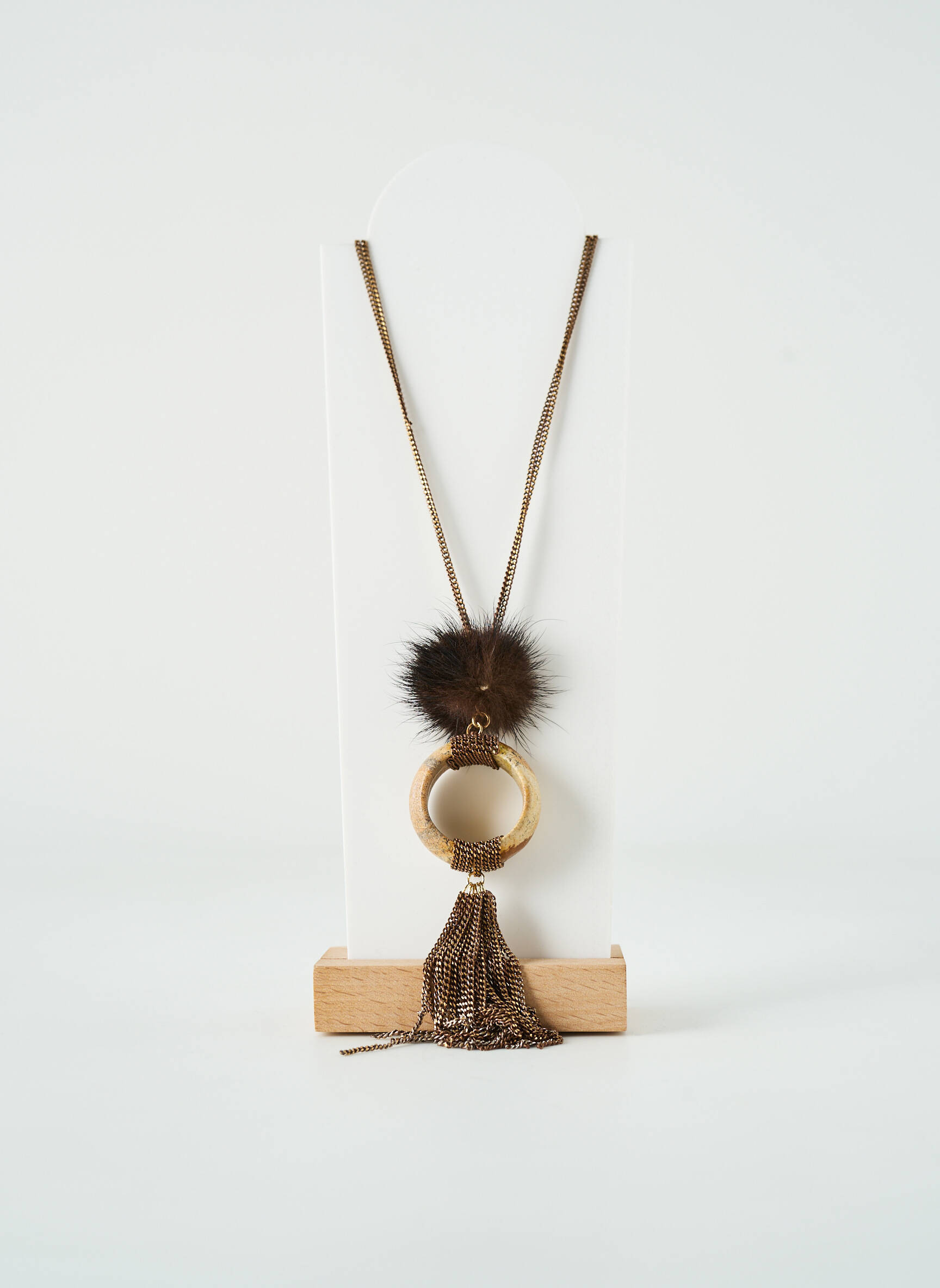 Ce sautoir de la marque TATA GISELE pour femme est la pièce idéale pour donner une touche d’originalité à votre tenue, tout en profitant d’un vrai bon plan. Sa chaîne longue et fine met en valeur un pendentif composé d’un cercle effet bois surmonté d’un pompon en fourrure synthétique douce et d’une cascade de fines chaînettes à franges, pour un rendu à la fois bohème et élégant. Ce bijou tendance, proposé à petit prix, permet de compléter facilement votre collection d’accessoires sans vous ruiner.
