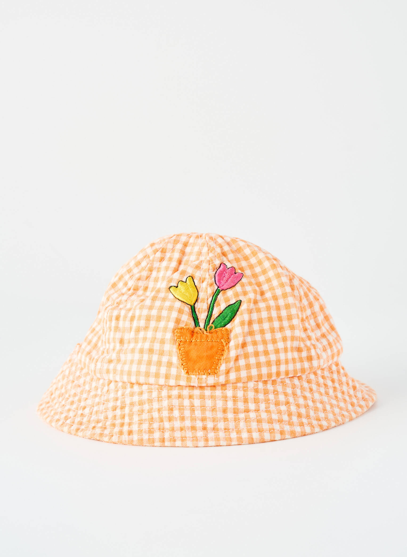 Voici le chapeau parfait pour offrir à votre fille un look tendance à petit prix. Avec son motif vichy orange et blanc plein de fraîcheur, il arbore une adorable broderie de fleurs en pot sur le devant, ajoutant une touche joyeuse et colorée idéale pour les beaux jours. Ce chapeau est un vrai bon plan pour accessoiriser toutes ses tenues sans se ruiner.