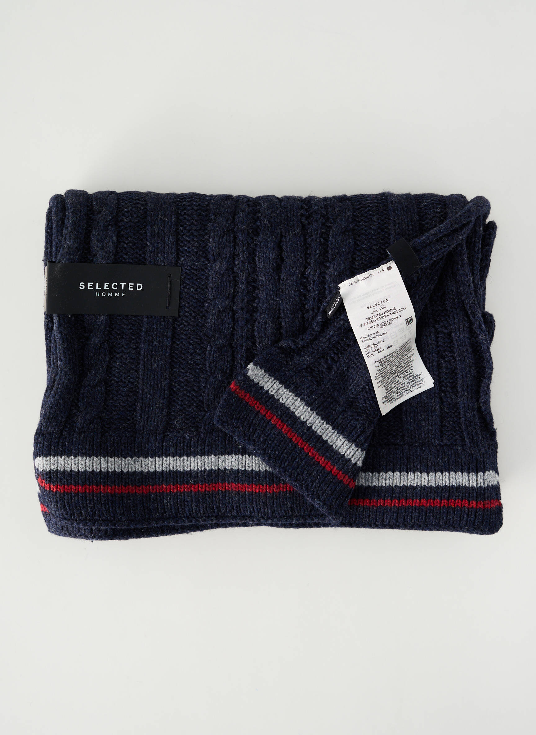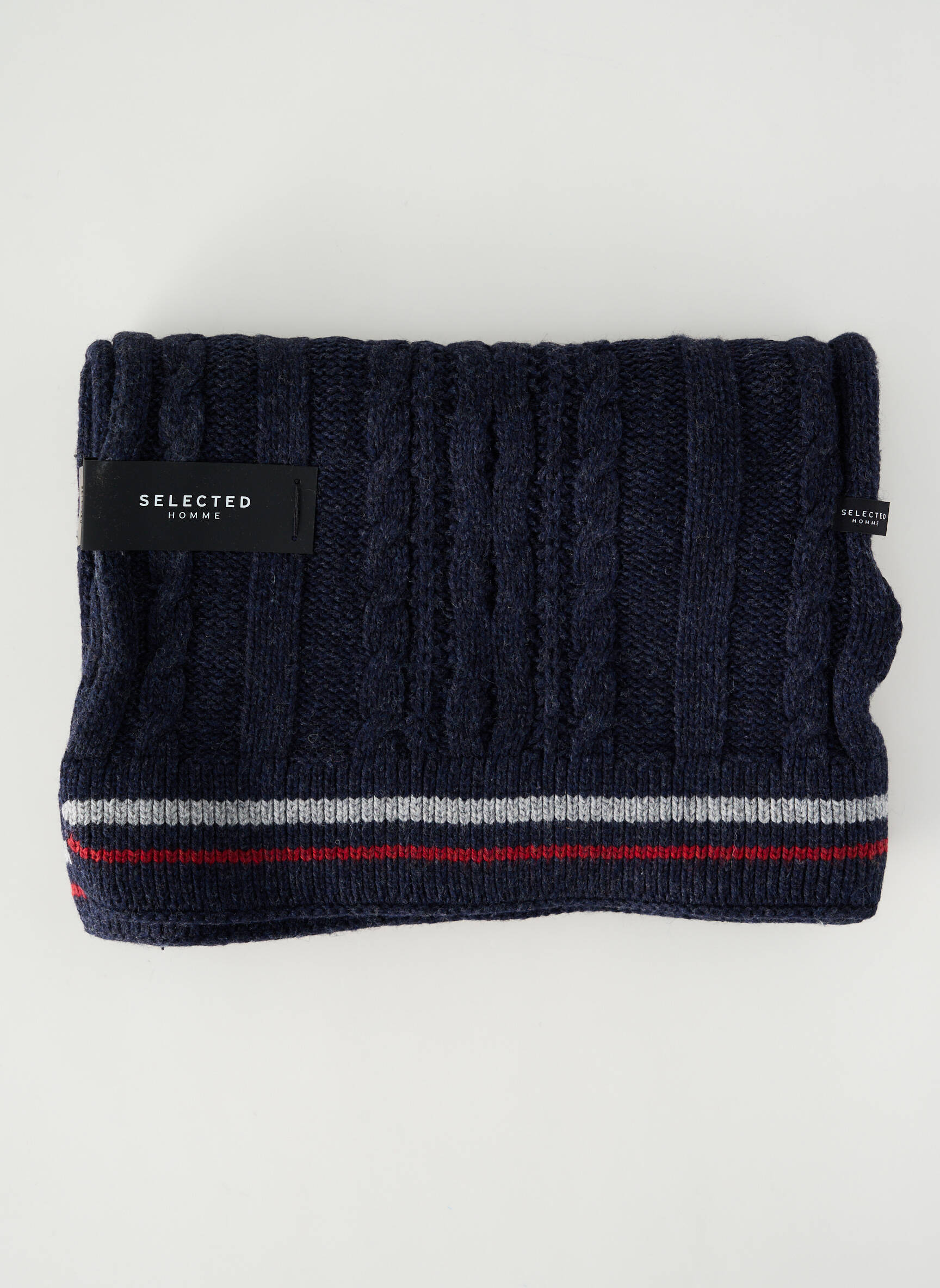 Profitez d’une belle affaire avec cette écharpe SELECTED pour homme, idéale pour rester stylé tout en faisant des économies. Son tricot bleu marine élégant est relevé par un motif torsadé subtil, tandis qu’une bande contrastée grise et rouge apporte une touche de modernité, le tout dans un esprit urbain et décontracté parfait pour tous les jours.