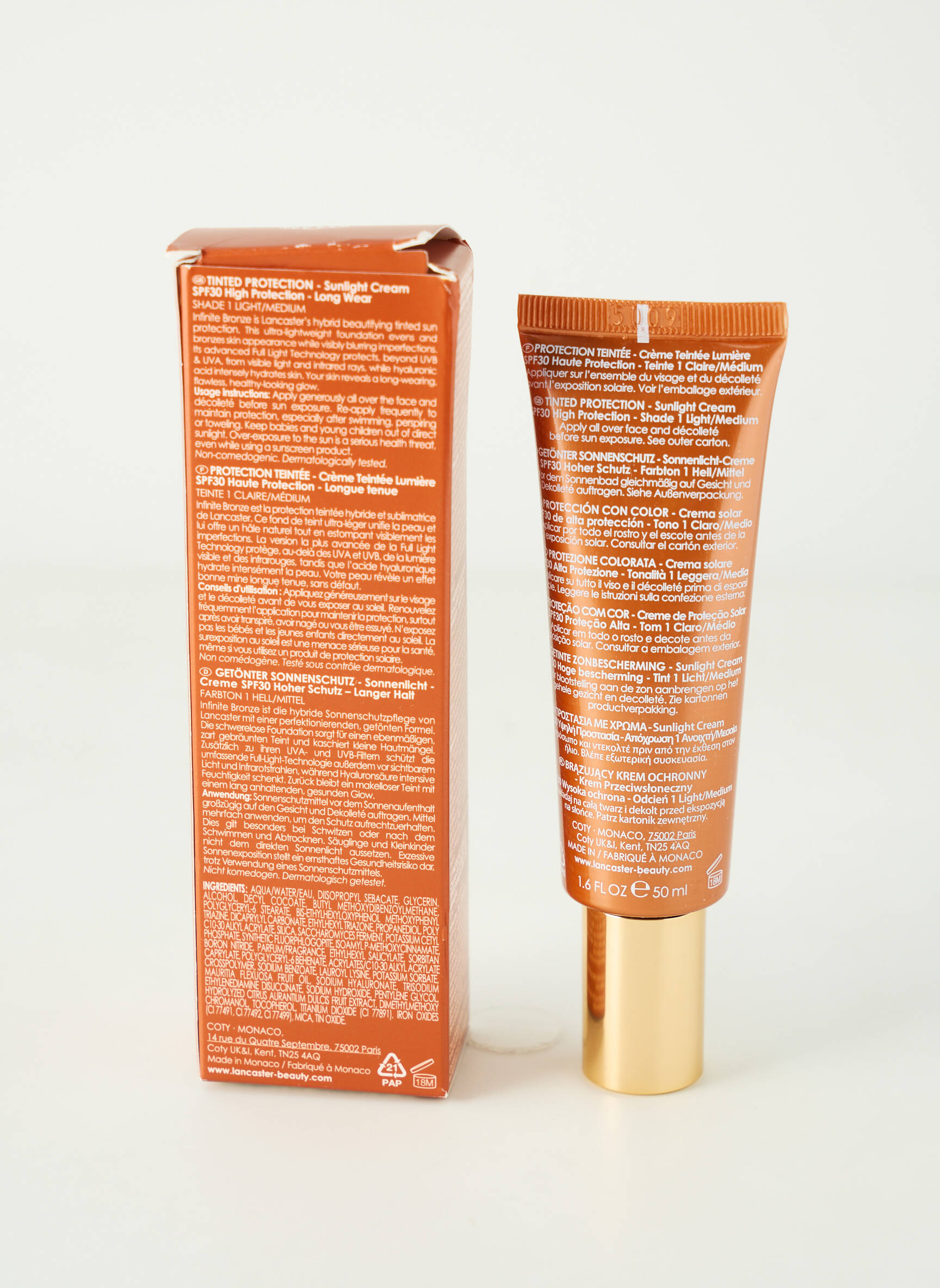 shade 1 light medium Infinite Bronze est la protection solaire teintée sublimatrice de Lancaster. Elle associe la protection d’un écran solaire, les propriétés d'un soin hydratant et les bienfaits bronzants et sublimateurs d'un fond de teint crémeux. La Crème Solaire Protectrice Teintée SPF 30 Infinite Bronze est un fond de teint crème éclatant et ultra-léger qui donne un hâle uniforme à la peau tout en atténuant visiblement les imperfections grâce à ses pigments haute performance et ses micro-perles. Sa technologie Full Light avancée protège de la lumière visible et des infrarouges (en plus des UVB et des UVA), tandis que l'acide hyaluronique hydrate intensément la peau. Son Complexe Activateur de Bronzage améliore le bronzage naturel de la peau. La texture crémeuse ultra-fine offre une couvrance modulable et uniforme pour un fini naturel effet seconde peau. Il se décline en 2 teintes parfaites, une teinte claire/moyenne pour un éclat naturel subtil et une teinte moyenne/foncée pour un éclat solaire bronzé. Votre peau révèle un éclat bonne mine lumineux et impeccable qui dure toute la journée. Appliquez généreusement la Crème Solaire Protectrice Teintée SPF 30 Infinite Bronze sur l'ensemble du visage et du décolleté avant l'exposition au soleil. Utilisez vos doigts, en partant du centre vers l’extérieur, ou appliquez le produit à l’aide d’un pinceau à fond de teint.Cette crème solaire hydratante visage convient aux peaux sensibles.