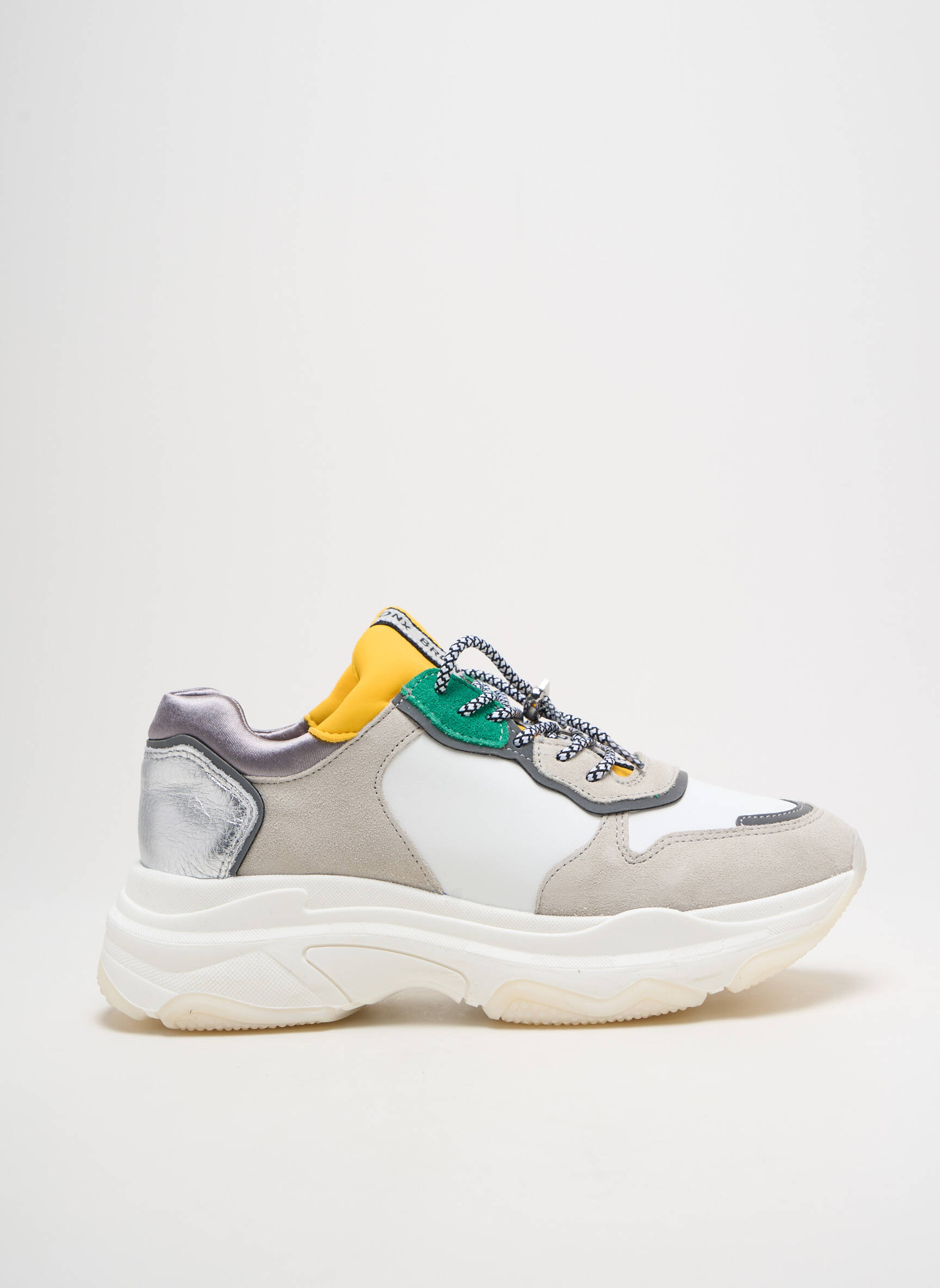 Craquez pour ces baskets BRONX pour femme, l'allié parfait des looks tendance à prix mini. Leur design unique mêle avec audace des touches de gris clair, de blanc éclatant, et des détails colorés au niveau du col et des lacets pour un style à la fois moderne et original. Le jeu de matières entre le tissu, le simili daim et la finition métallisée à l’arrière apporte une vraie valeur ajoutée à ce modèle, tout en restant accessible pour se faire plaisir sans se ruiner. Idéale pour affirmer votre style streetwear tout en réalisant une belle économie, cette basket multitons deviendra un incontournable de votre dressing cette saison.
