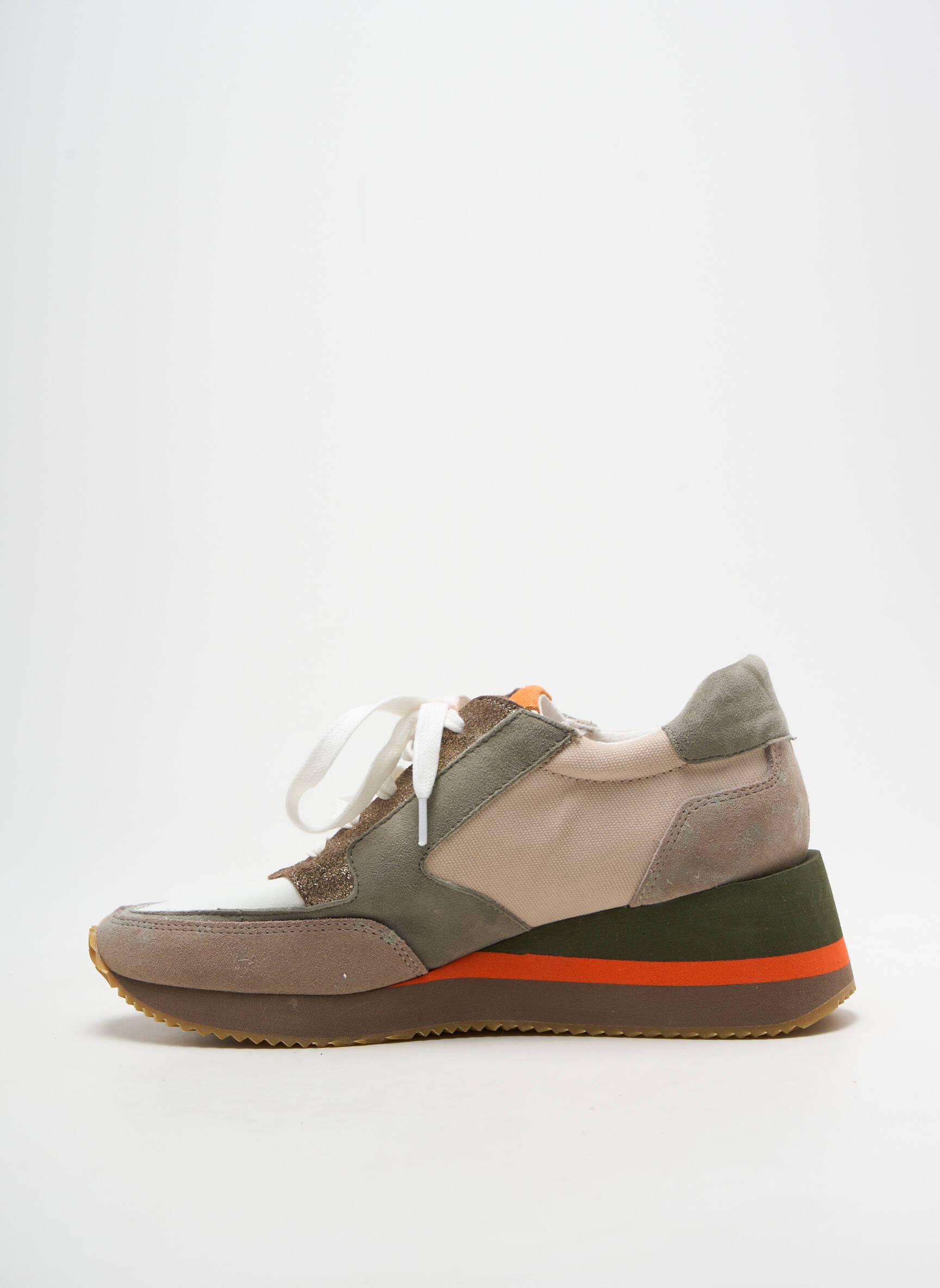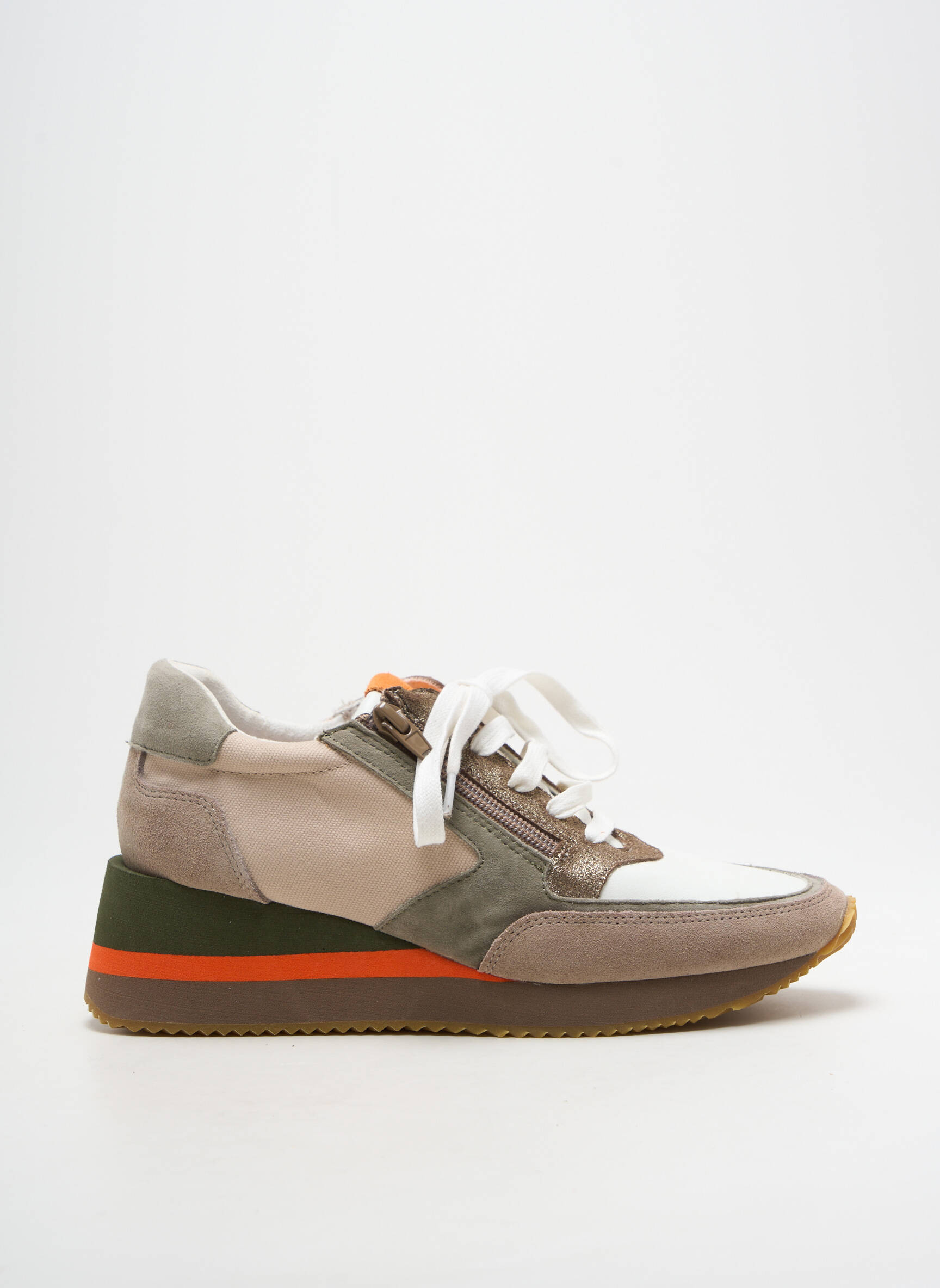 Craquez pour ces baskets femme EMILIE KARSTON, un bon plan parfait pour allier style et économies. Ce modèle séduit par son mélange de matières et de couleurs douces, rehaussées d’une touche de vert et d’orange sur la semelle, pour une allure tendance sans effort. La fermeture zippée sur le côté apporte une note pratique en plus du laçage classique, tandis que la semelle légèrement compensée assure confort et modernité à chacun de vos pas. Profitez de cette opportunité pour vous offrir une chaussure chic et originale à prix tout doux.