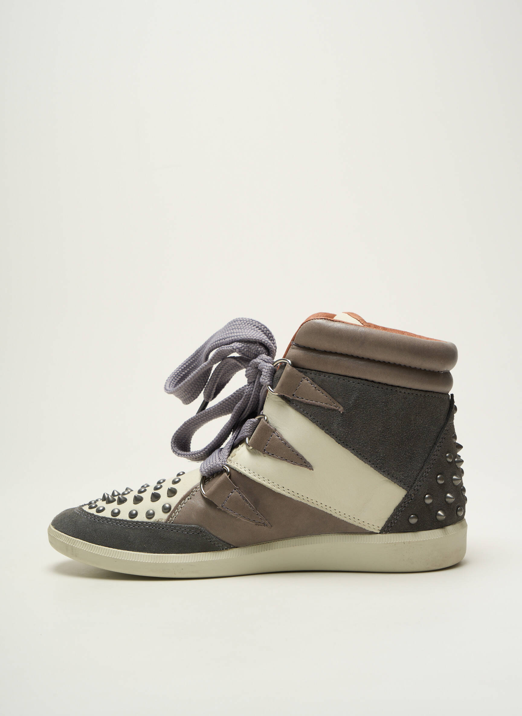 Profitez d’une vraie bonne affaire avec cette basket GROUNDFIVE pour femme, idéale pour donner une touche tendance et originale à vos looks sans vous ruiner. Sa combinaison élégante de matières dans des tons de gris et taupe s’associe à de larges lacets pour un confort optimal, tandis que les clous métalliques sur l’avant et à l’arrière apportent une note rock très moderne. Ce modèle à la silhouette montante et à la semelle claire mise tout sur le style urbain à prix malin, parfait pour se démarquer au quotidien sans compromis sur le budget.