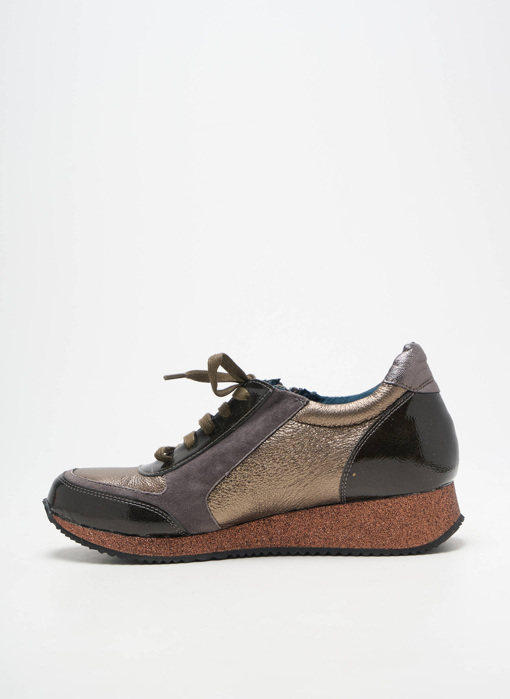 Craquez pour cette basket femme de la marque KARSTON, une belle opportunité à petit prix pour profiter du style sans compromis. Avec ses nuances métalliques, ses reflets bronze et sa semelle compensée effet liège, ce modèle mise autant sur le confort que sur l’originalité, le tout à un tarif exceptionnel pour compléter votre collection avec élégance et sans vous ruiner.