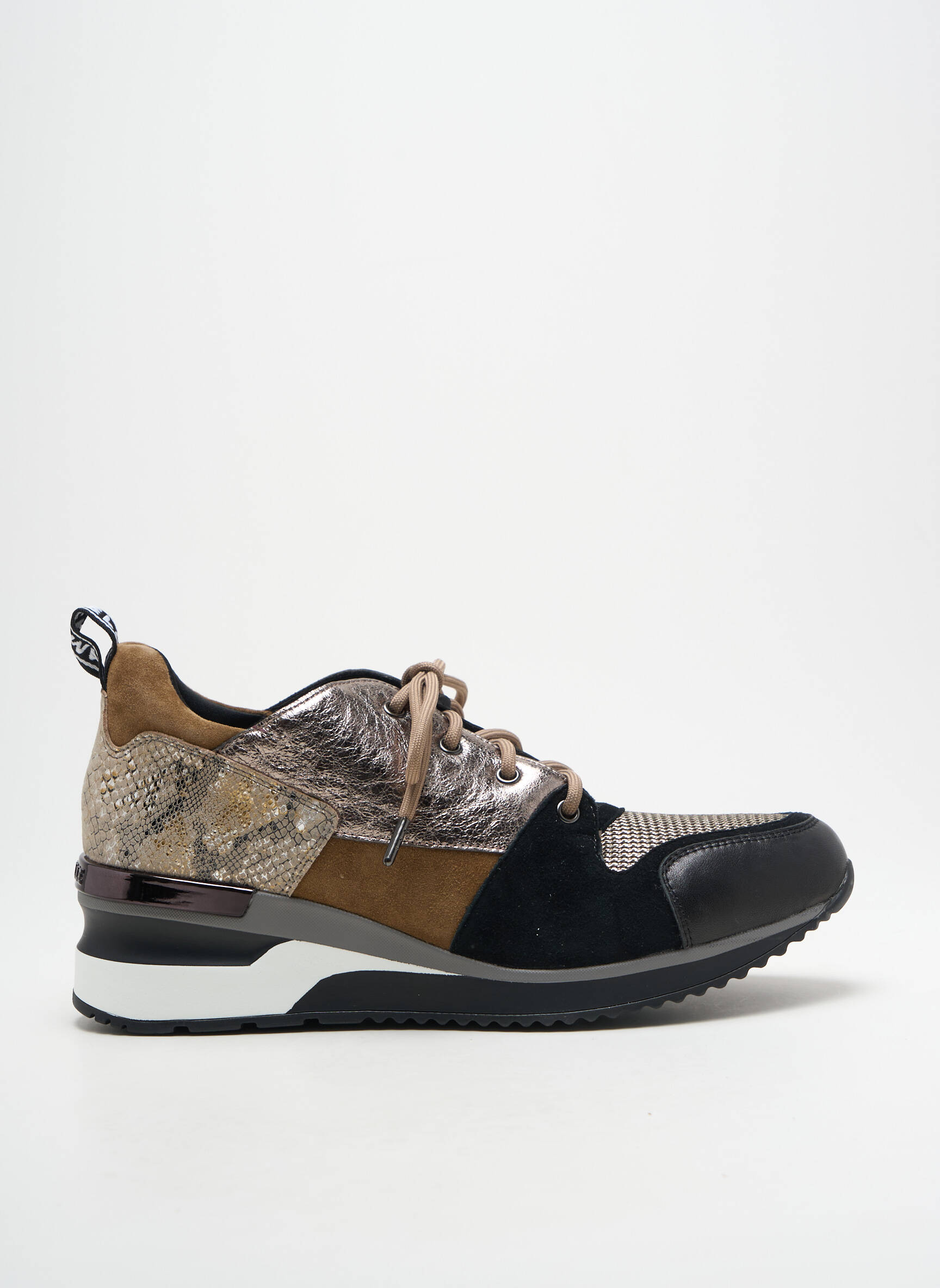 Craquez pour ces baskets MAM'ZELLE pour femme qui allient tendance et petit prix, offrant un style moderne sans vous ruiner. Ce modèle joue sur les contrastes de textures et de matières, mêlant effet python, touches de suédine marron et empiècements noirs pour un look urbain et chic. La semelle épaisse bicolore vous assure confort et dynamisme à chaque pas, tandis que les lacets beiges apportent une note élégante et discrète. Idéales pour dynamiser toutes vos tenues du quotidien, ces baskets à prix doux sont le bon plan à ne pas manquer pour faire rimer élégance et économies.