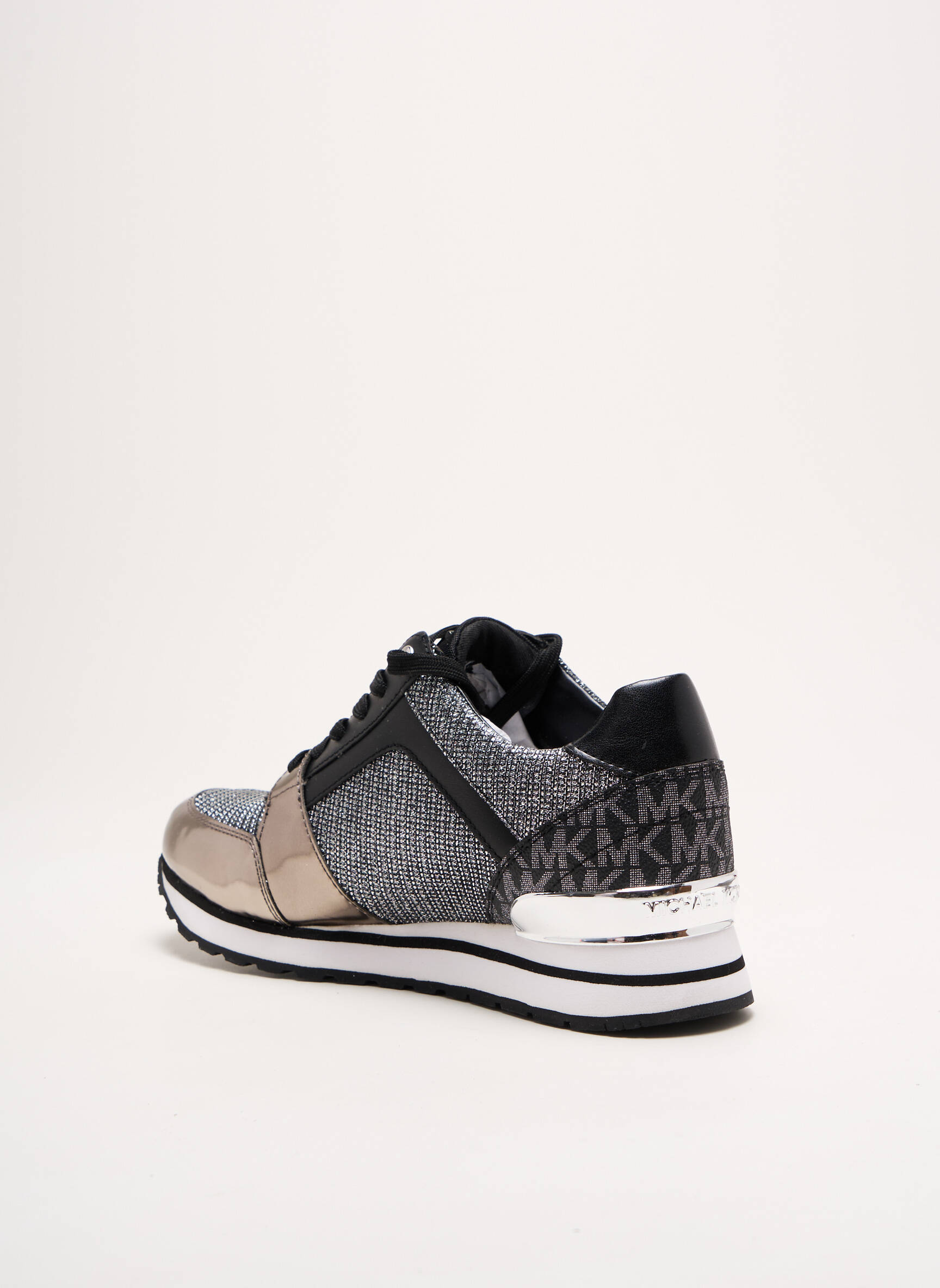 Osez l'allure audacieuse mêlée à l'élégance urbaine avec ces baskets MICHAEL KORS pour femme, qui captivent par leur alliance subtile de textures métalliques et textiles sophistiqués ; leur silhouette à la fois sportive et raffinée se pare d'un jeu de contrastes entre un gris anthracite chiné, des touches brillantes bronze et des détails en cuir verni noir, tandis que la semelle blanche à triple couche avec liseré noir assure légèreté et dynamisme à chaque pas.