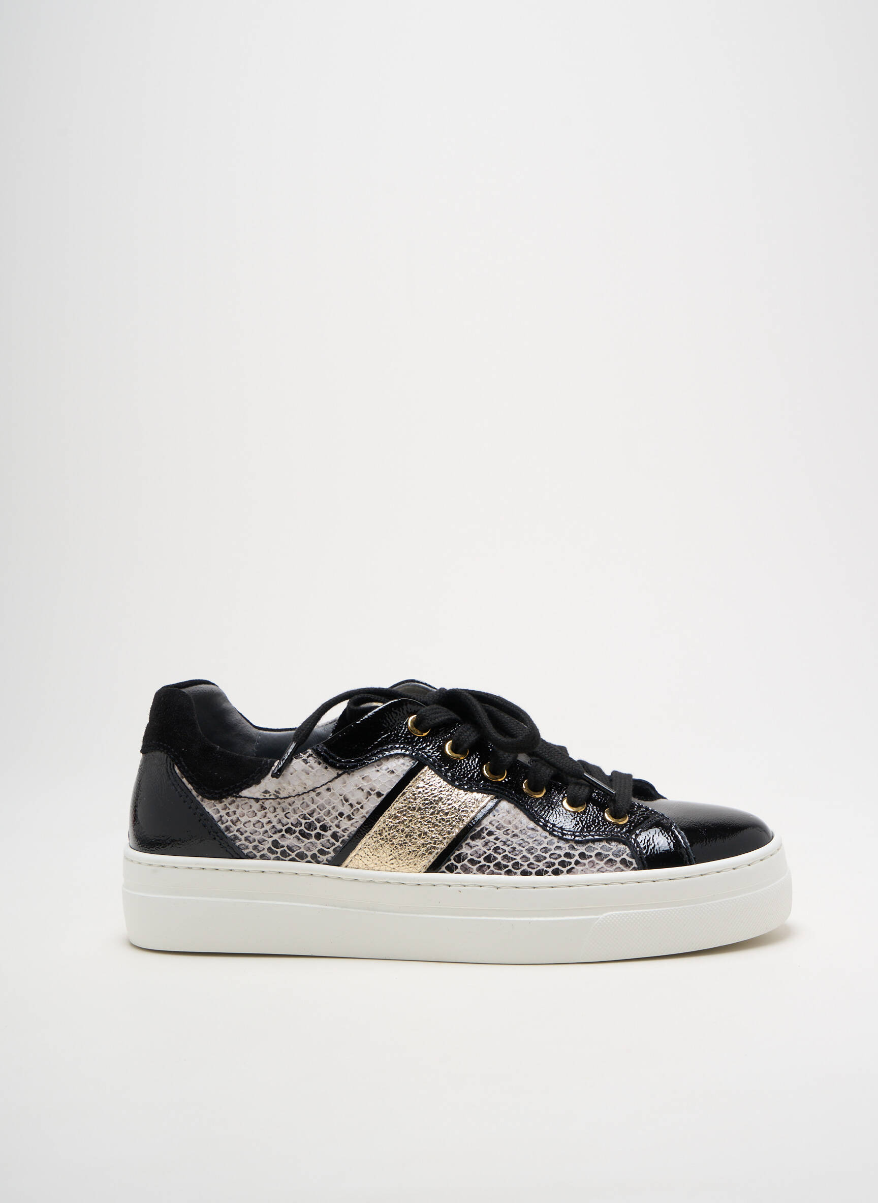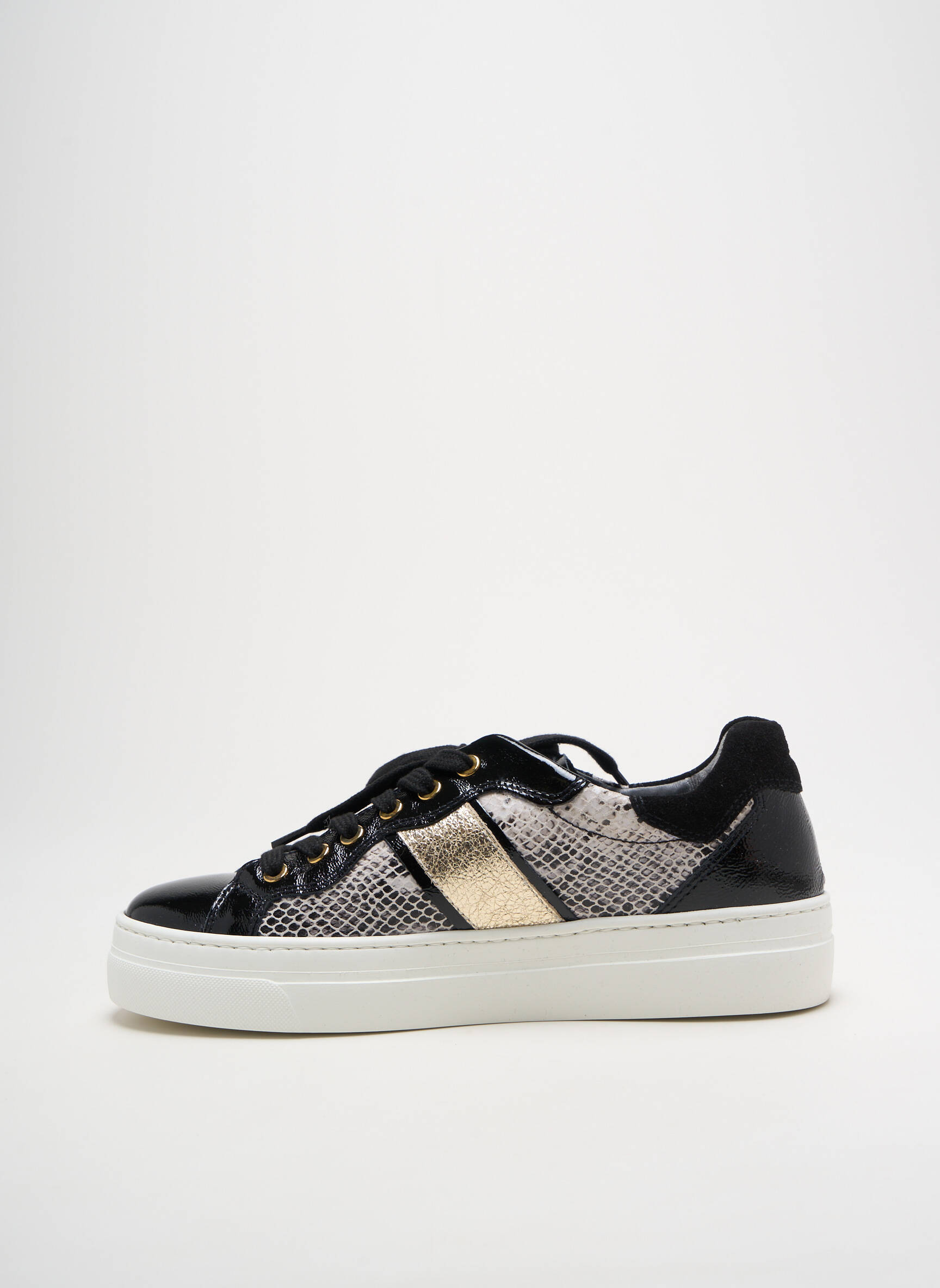 Craquez pour ces baskets femme NERO GIARDINI, le bon plan idéal pour allier style et petits prix. Ce modèle affiche une élégante association de noir brillant et d’empiècements dorés façon python, parfait pour donner une touche chic et tendance à toutes vos tenues du quotidien. Grâce à leur semelle épaisse et leur finition soignée, ces baskets conjuguent confort et modernité à prix irrésistible.