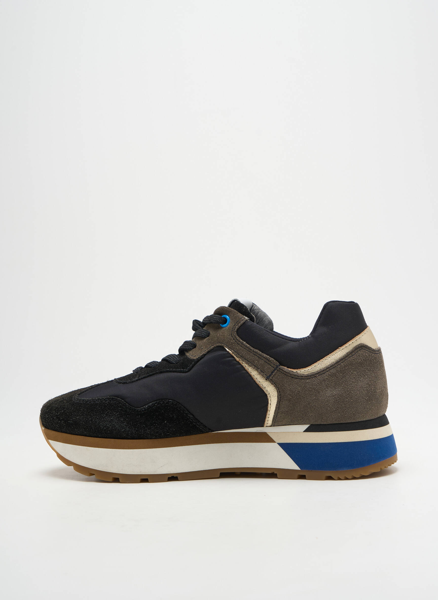 Profitez d'un bon plan exceptionnel avec cette basket pour femme signée NERO GIARDINI, un modèle à l’allure dynamique et urbaine. Sa combinaison de textile noir, cuir velours taupe et détails contrastés, rehaussée par une touche de bleu et une broderie rose sur le côté, apporte une note sportive à vos tenues tout en restant élégante. Sa semelle confortable et son style actuel font de cette chaussure un choix idéal pour celles qui veulent se faire plaisir sans se ruiner.