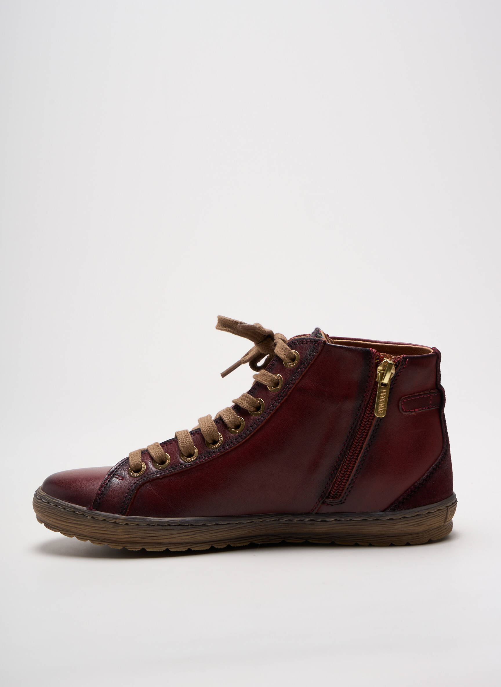 Voici une occasion à ne pas manquer pour adopter un style tendance sans vous ruiner avec cette basket montante Pikolinos pour femme, idéale pour donner du caractère à votre look tout en profitant d'un prix déstocké exceptionnel. Son cuir bordeaux subtilement patiné, associé à des détails soignés comme une bride à boucle dorée et des lacets contrastés, en fait un choix confortable et original pour tous les jours, parfait pour faire la différence sans compromis sur l’élégance ou le budget.