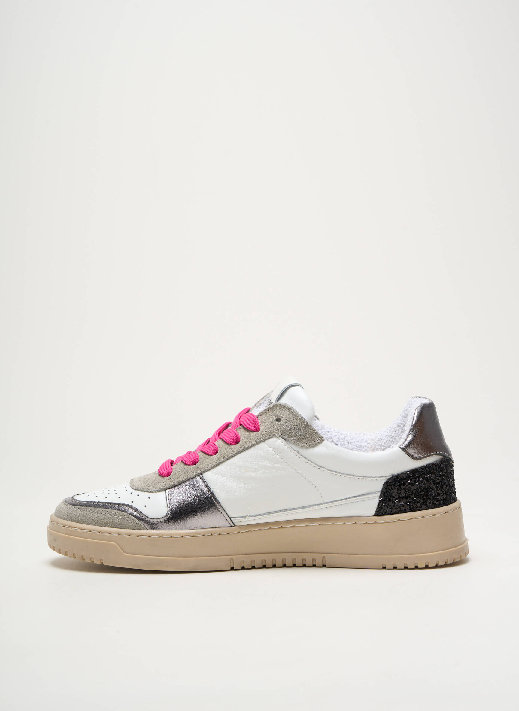 Profitez d’un super bon plan avec cette paire de baskets PLAY ONE pour femme qui allie style urbain et détails tendances à prix mini. Son look moderne est accentué par des empiècements métallisés argentés et noirs pailletés, tandis que les lacets fuchsia apportent une touche de pep’s à ce modèle facile à porter au quotidien. Son contraste entre l’empeigne blanche et la semelle beige assure un effet mode tout en simplicité, parfait pour compléter toutes vos tenues décontractées sans vous ruiner.