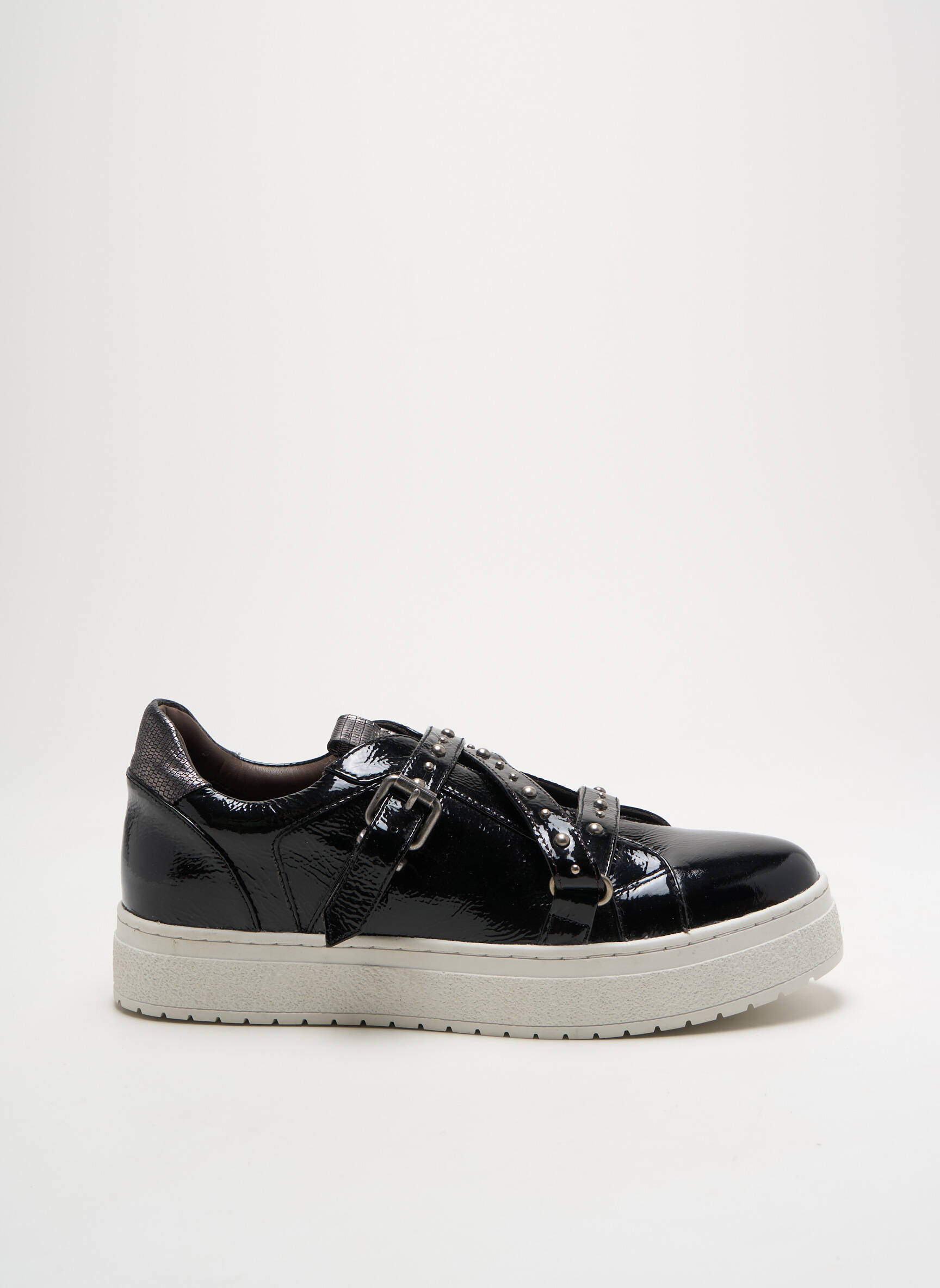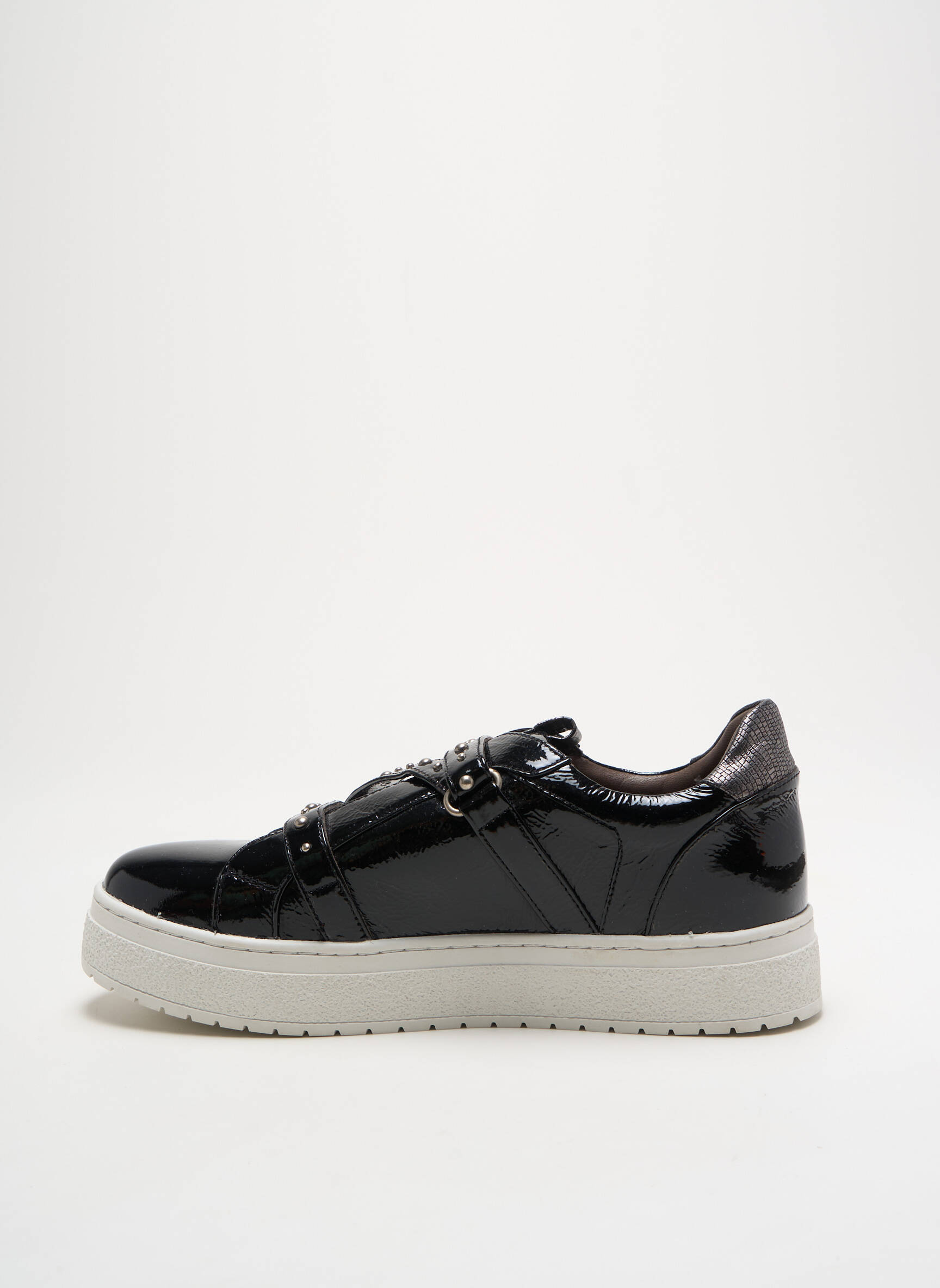Craquez pour ces baskets REGARD pour femme, proposées à prix exceptionnel, qui associent élégance et originalité grâce à leur finition vernie noire très brillante et leurs détails de brides et de boucles sur le dessus. Leur semelle épaisse apporte une touche moderne tout en garantissant un confort optimal au quotidien, vous permettant de faire sensation sans vous ruiner.
