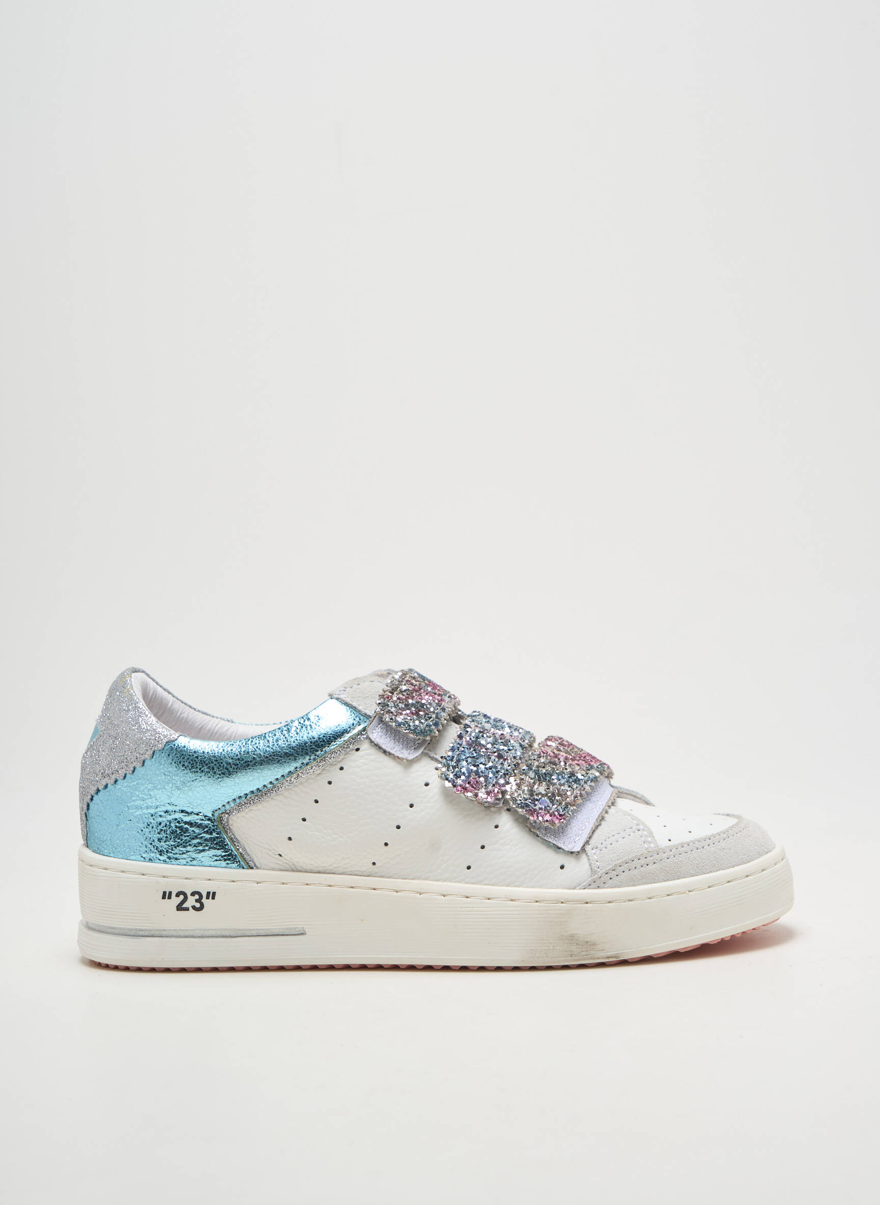 Craquez pour cette paire de baskets Semerdjian pour femme qui allient style et économie, parfaites pour profiter des dernières tendances à prix réduit. Avec leur design moderne, elles séduisent par leurs empiècements métallisés bleu et argent et leurs trois scratchs pailletés multicolores pour une touche fun et branchée, le tout sur une base blanche facile à assortir à toutes vos tenues. C’est le bon plan mode du moment pour afficher un look unique sans se ruiner.