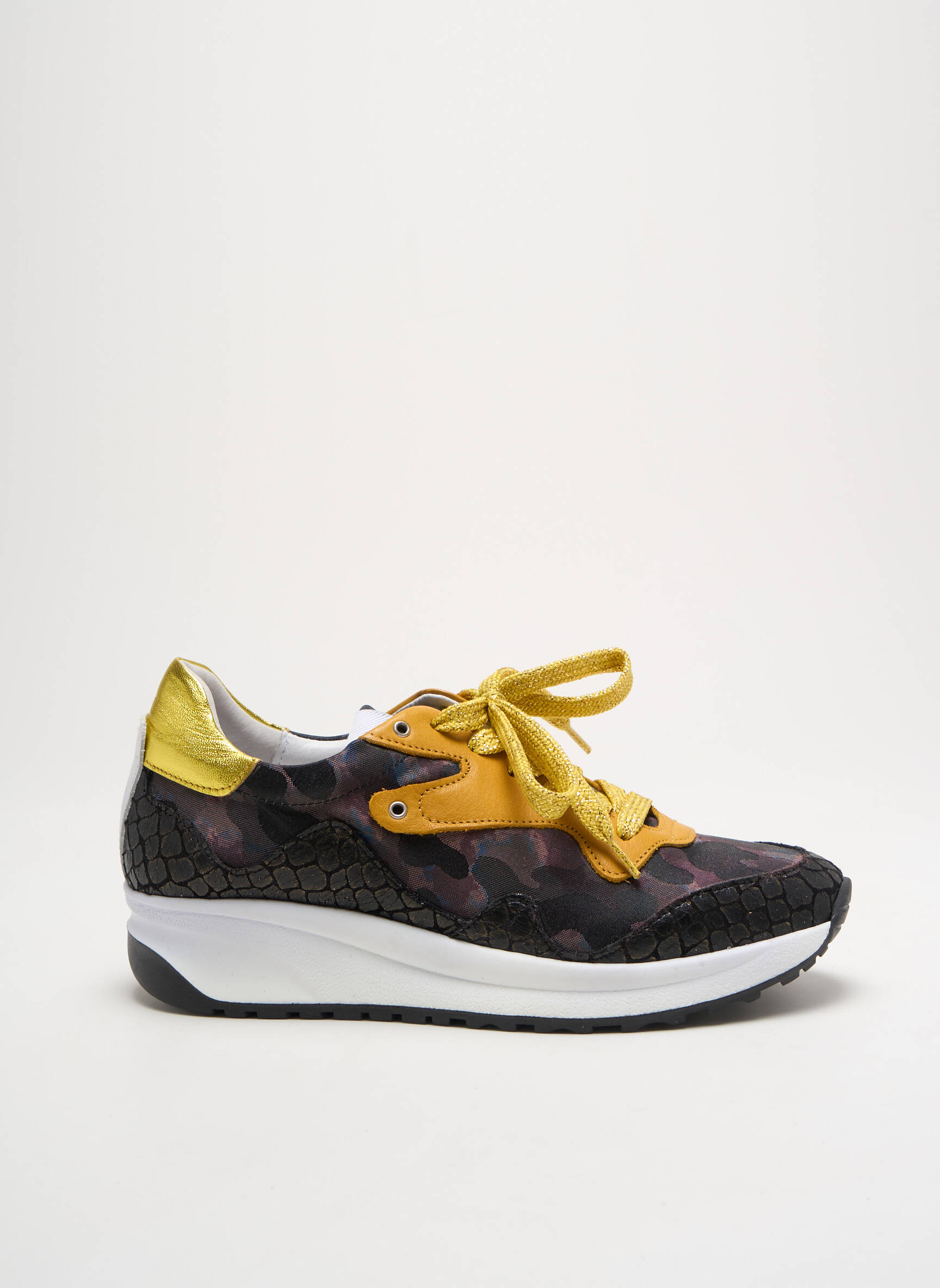 Profitez d’un vrai bon plan avec cette basket femme signée VADDIA, parfaite pour rehausser votre style sans vous ruiner. Son design original combine des touches de jaune lumineux et un imprimé à effet camouflage, tandis que le jeu de matières sur l’empeigne apporte un côté tendance très actuel. Les lacets contrastants et le détail texturé sur le talon ajoutent une note urbaine à ce modèle aussi confortable qu’élégant, idéal pour accompagner vos tenues dans un esprit casual chic à prix malin.