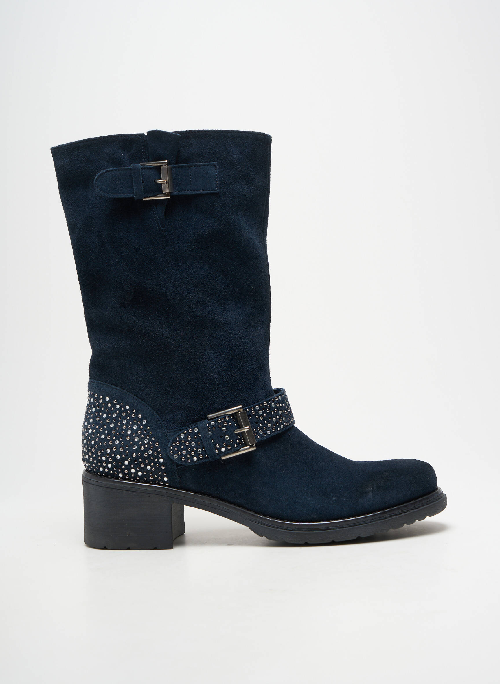 Craquez pour ces bottes femme JANET SPORT à petit prix, parfaites pour allier style et économies sans compromis. Leur design en suédine bleu marine apporte une touche de modernité, sublimée par un talon confortable et des détails métalliques raffinés comme les boucles argentées. L’arrière du pied se démarque avec un empiècement orné de petits clous brillants qui ajoutent une note tendance et originale à votre look. Une occasion unique de vous offrir le chic à prix réduit !