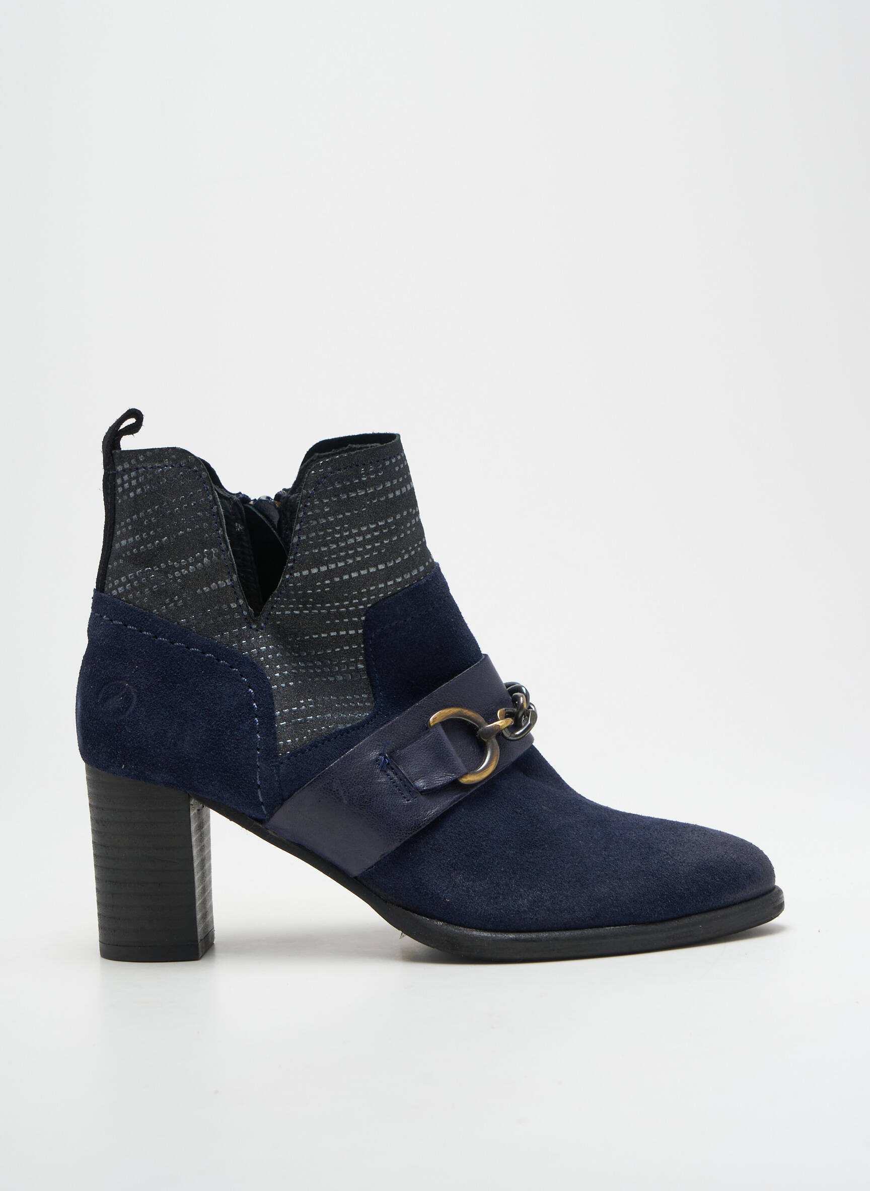 Voici une occasion à ne pas manquer pour compléter votre garde-robe avec style sans vous ruiner : ces bottines femme de la marque CASTA séduisent par leur élégance moderne et leur look bicolore, mariant un bleu marine profond à des empiècements texturés. Leur talon épais assure confort et stabilité, tandis que le détail métallique sur la bride apporte une touche sophistiquée, idéale pour rehausser toutes vos tenues citadines à prix tout doux.