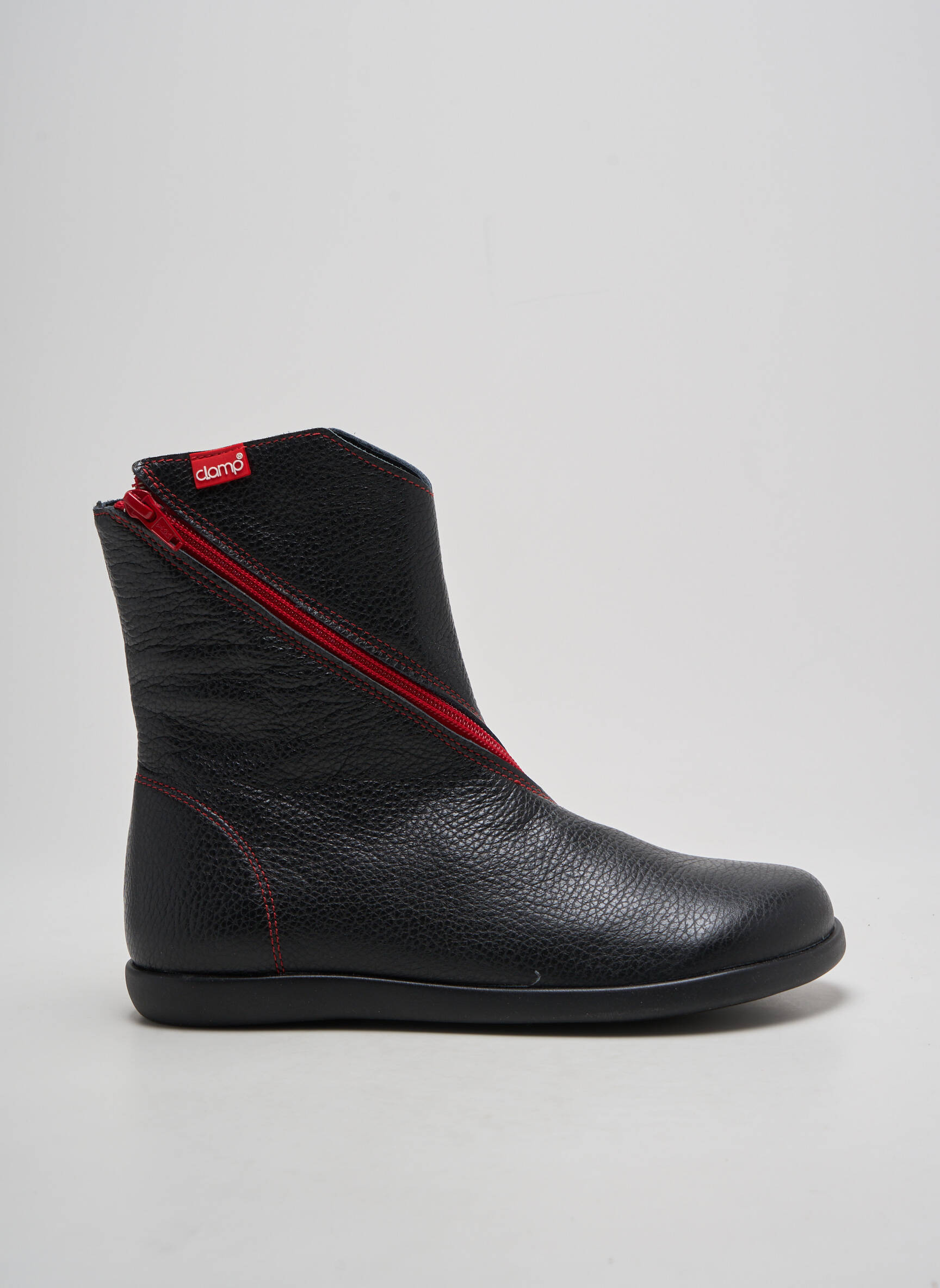 Ne manquez pas l'occasion de vous offrir ces bottines CLAMP pour femme à prix déstocké, qui associent élégance moderne et confort au quotidien. Leur silhouette noire graphique est dynamisée par une fermeture zippée rouge contrastante qui apporte une touche originale et tendance à vos tenues, tandis que leur cuir souple et leur semelle fine assurent un look raffiné à petit prix.