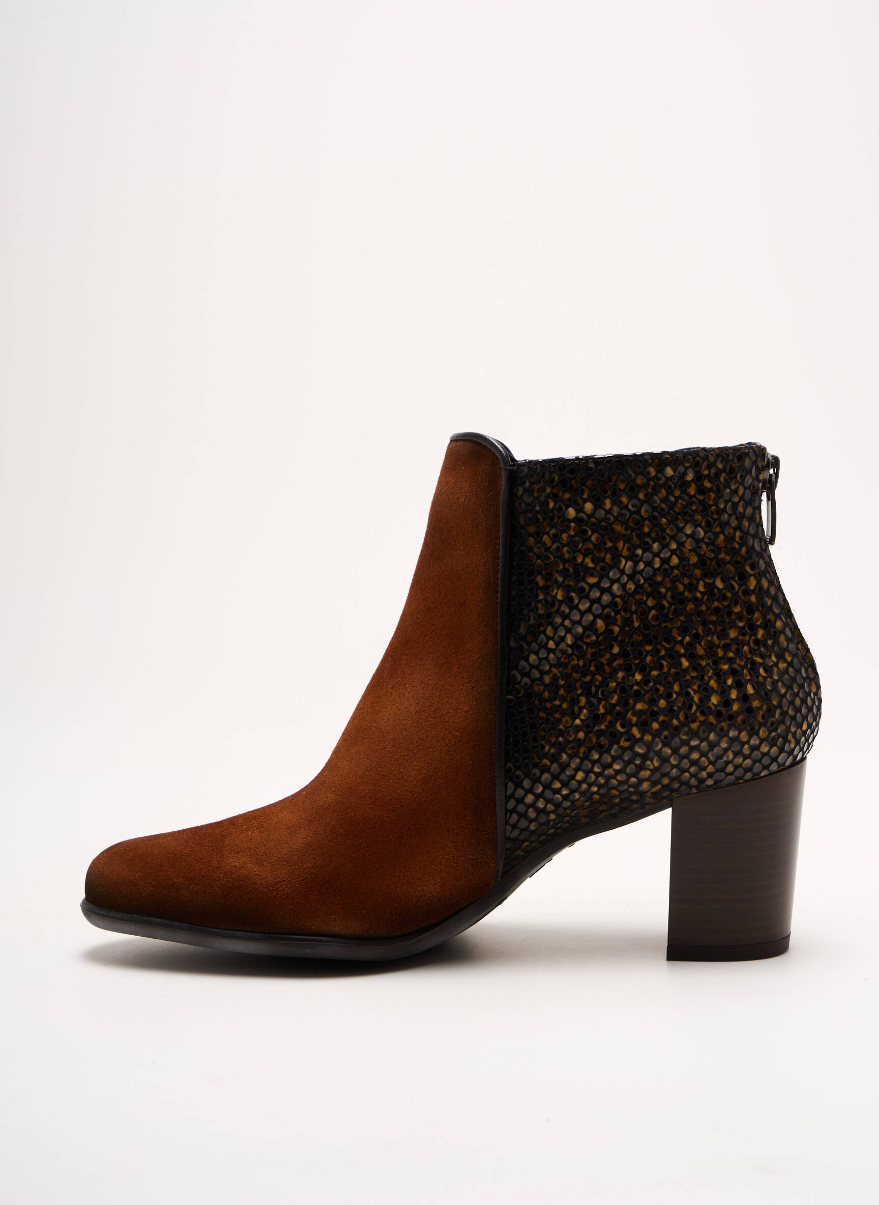 Imaginez un coup de cœur instantané mêlant sophistication et audace : ces bottines DORKING pour femme dévoilent une silhouette élégante en suède bicolore, où un chaleureux brun camel contraste avec un imprimé effet léopard discret sur le côté, sublimé par un talon épais et confortable qui allie allure et stabilité, tandis qu'un zip dissimulé à l'arrière facilite l'enfilage avec une touche moderne.