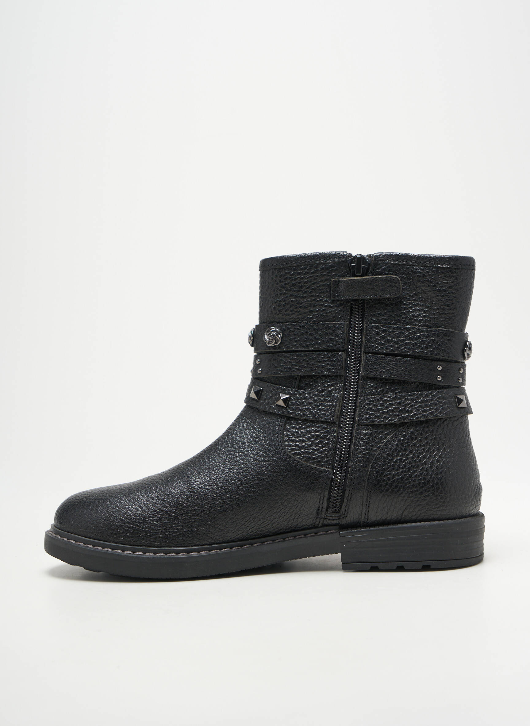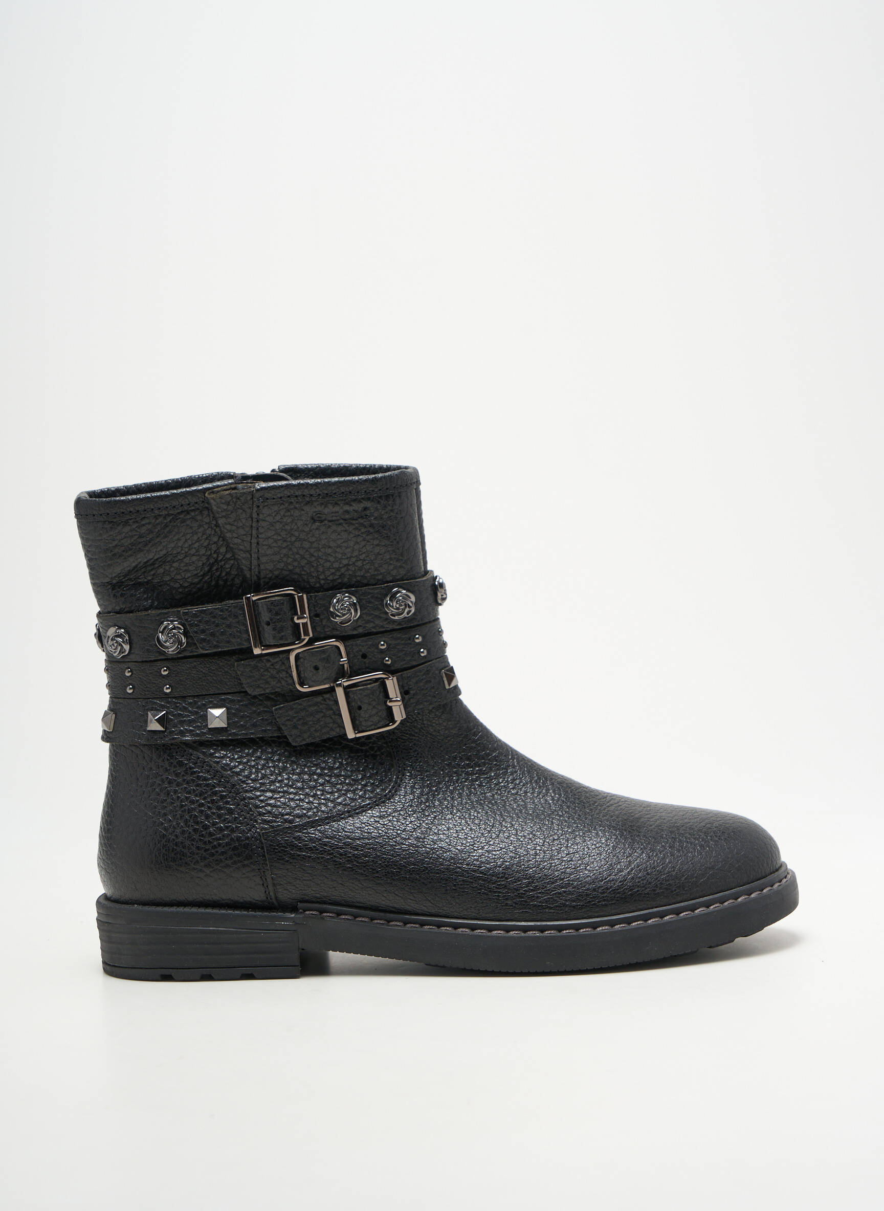 Craquez pour ces bottines GEOX pour femme à prix mini, une véritable aubaine pour allier style et économie. Ce modèle noir séduit par sa matière texturée et son design moderne, sublimé par des brides décoratives à boucles et des clous métalliques pour une touche rock élégante. C’est le bon plan parfait pour compléter votre garde-robe avec une paire de boots tendance, confortable et facile à assortir, sans vous ruiner.
