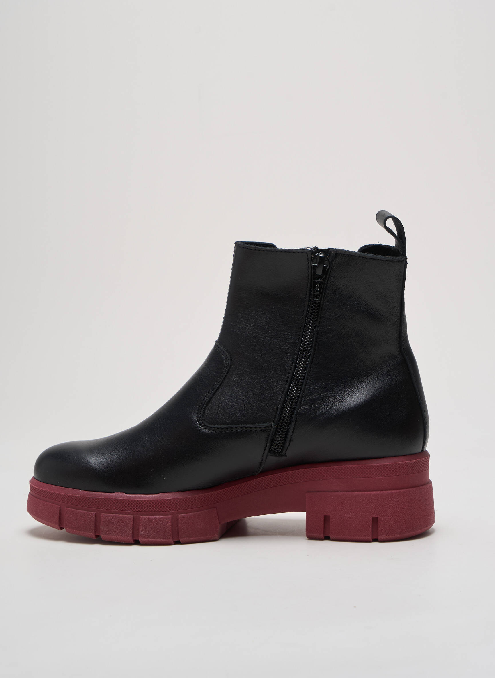 Osez l’alliance parfaite entre audace et élégance avec ces bottines HIRICA qui incarnent un esprit urbain résolument moderne. Leur cuir noir lisse offre une silhouette épurée tandis que l’élastique latéral joue la carte du contraste avec un subtil dégradé bordeaux, se prolongeant harmonieusement sur une semelle épaisse et rainurée de la même teinte vibrante. Une boucle arrière pratique complète ce modèle, apportant à la fois style et facilité d’enfilage, idéal pour affronter la ville avec assurance et originalité.