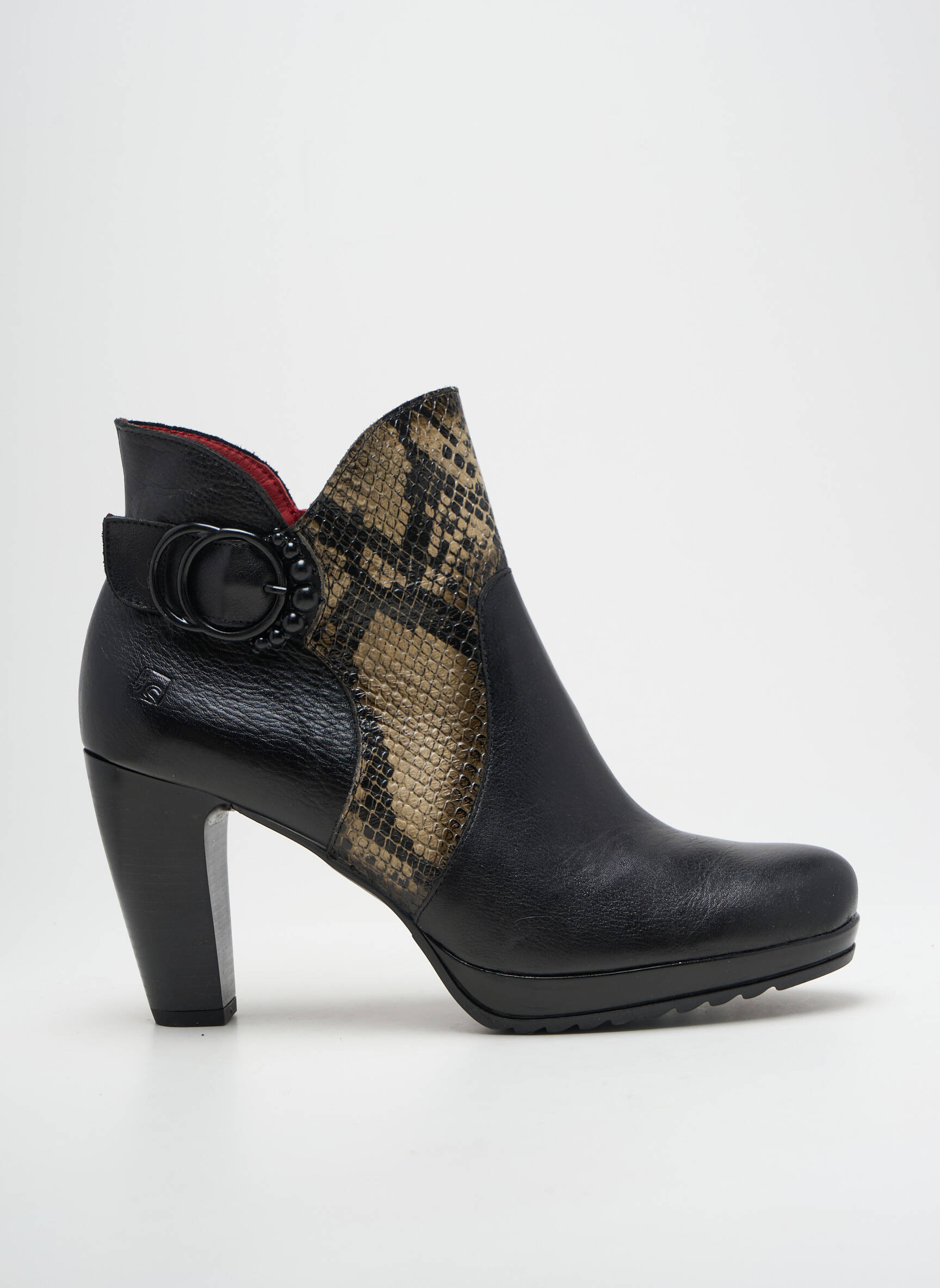 Profitez d’une offre exceptionnelle sur ces bottines JOSE SAENZ pour femme qui allient parfaitement élégance et modernité sans vous ruiner. Ce modèle arbore un mélange raffiné de cuir noir et d’empiècements façon python, sublimé par un détail de boucle sur le côté pour une touche sophistiquée et originale. Le talon épais assure stabilité et confort au quotidien, tandis que la découpe asymétrique met en valeur la cheville avec style. Ces boots sont le bon plan idéal pour apporter du cachet à toutes vos tenues à prix doux.
