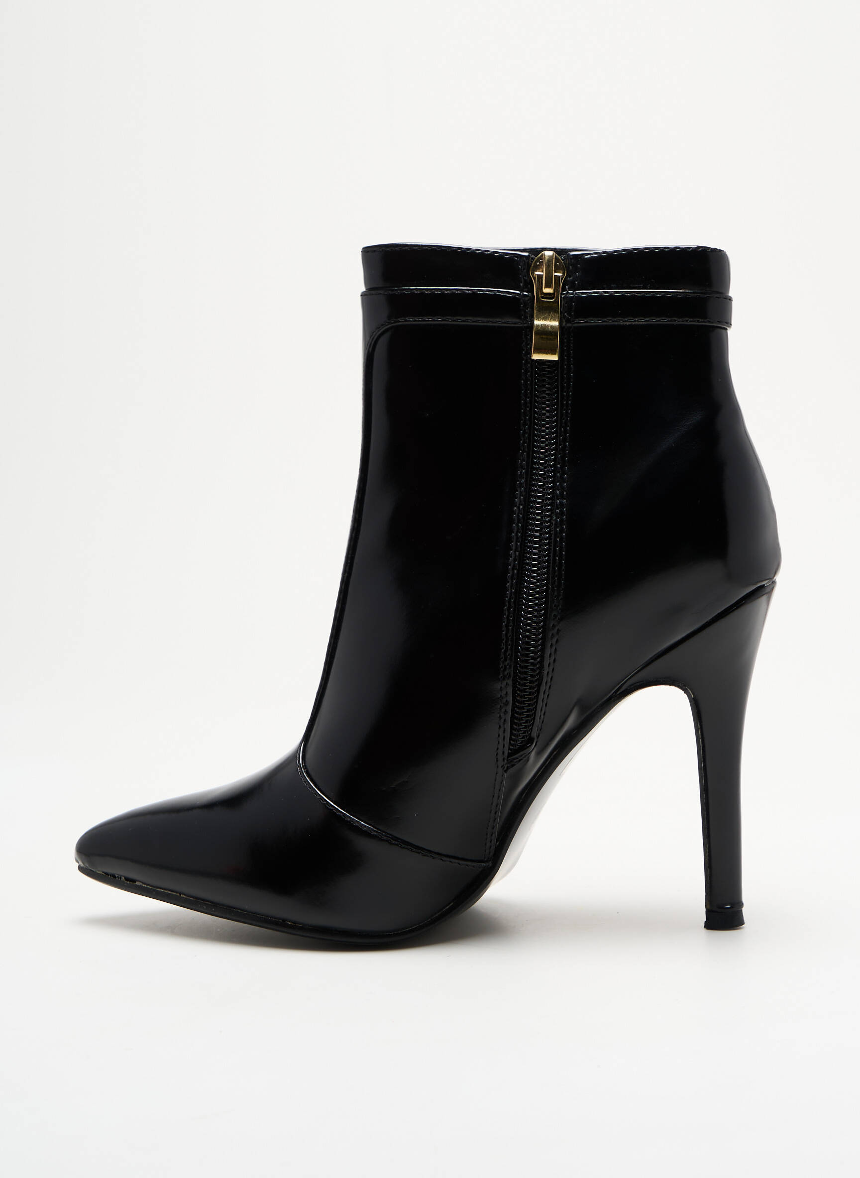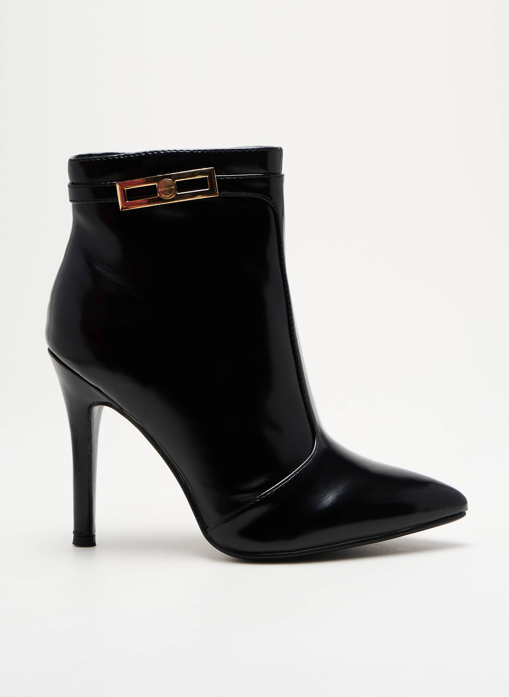 Osez l’élégance tranchante avec ces bottines signées KS, où la brillance du cuir noir lisse rencontre une silhouette fuselée et un talon aiguille affirmé, sublimée par une fine bandoulière ornée d’une boucle métallique dorée qui vient rehausser le chic sophistiqué de cette pièce incontournable.